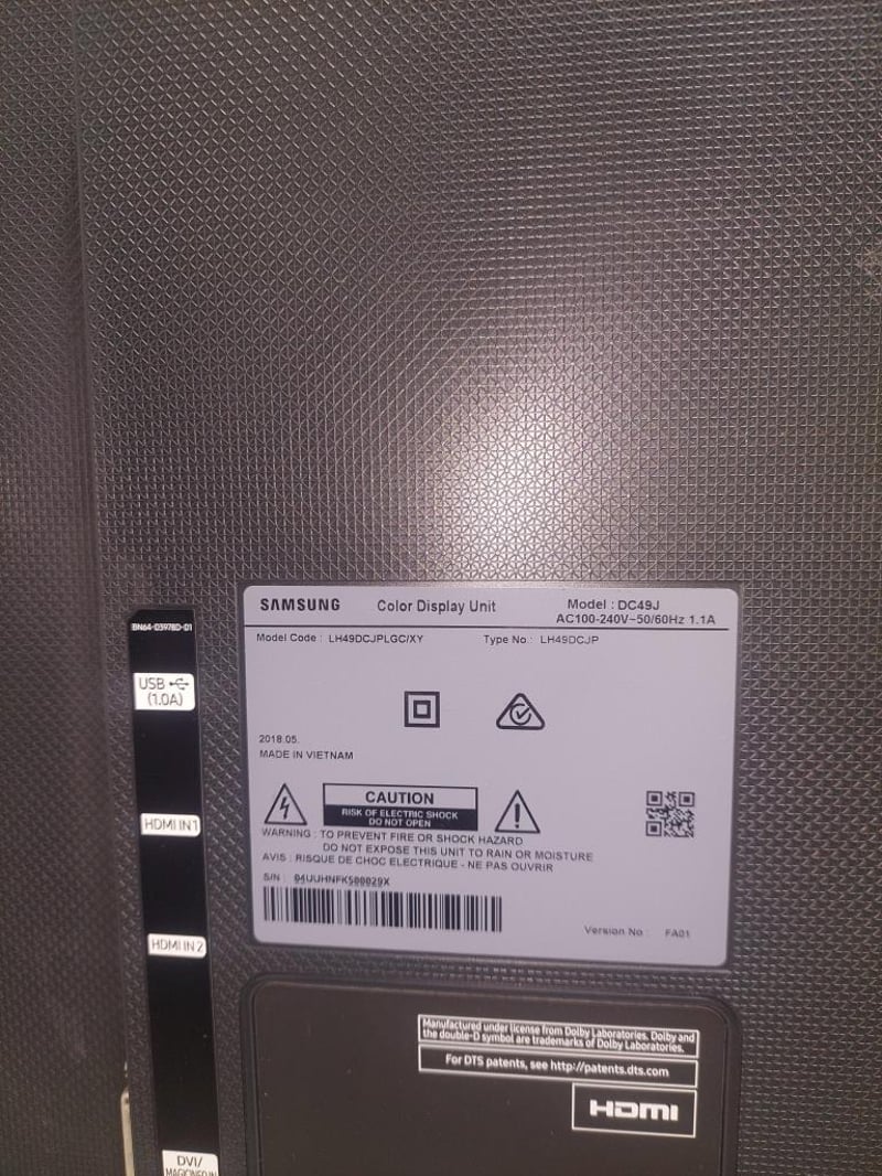 Samsung 49 inch display monitor. Model: LH49DCJPLGC/XY Serial number: 04UUHNFk500029X Dims: 112cm x 63cm x 5cm Note: item is untested. Power cable not included.