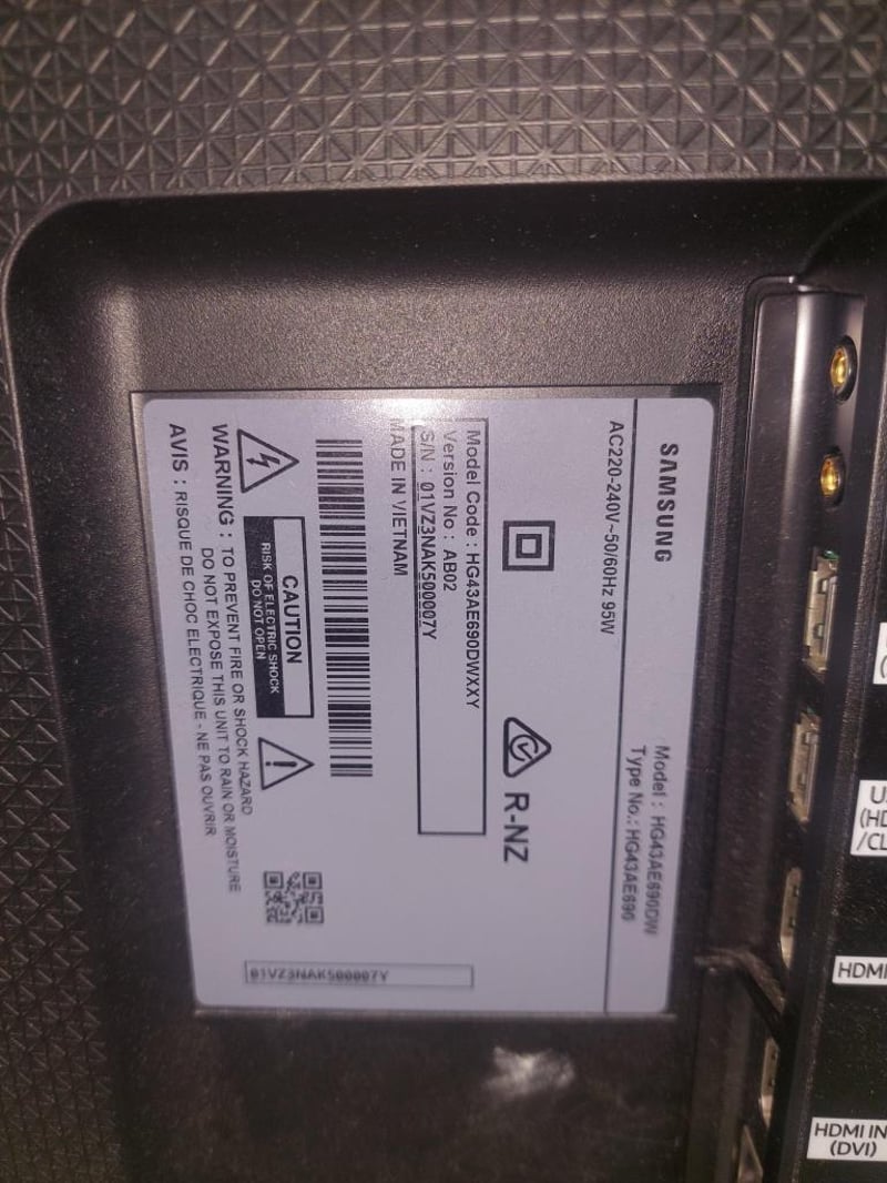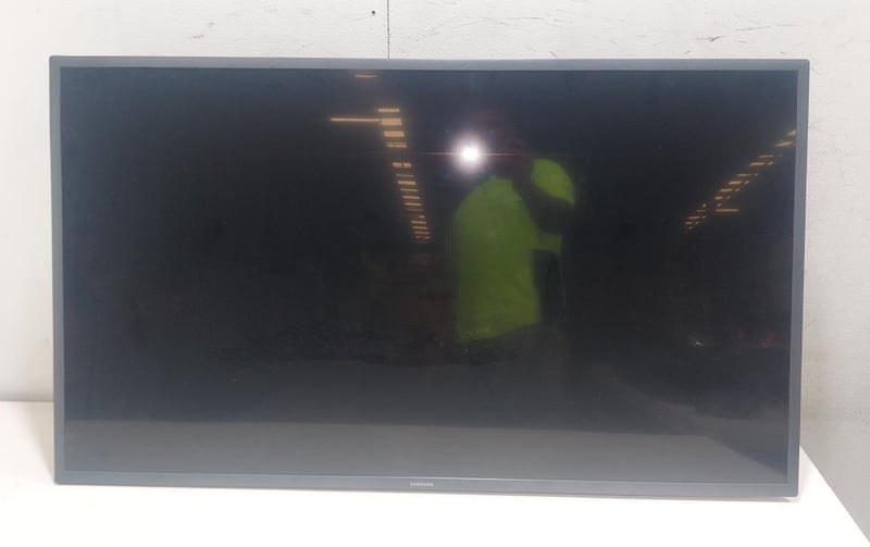 Samsung 43 inch television.Model: HG43AE690DWSerial number: 01VZ3NAK500007YDims: 98cm x 55cm x 5cm Note: unit is untested, power cable not included.