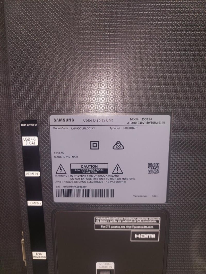 Samsung 49 inch display monitor. Model: LH49DCJPLGC/XY Serial number: 04UUHNFK500036F Dims: 112cm x 63cm x 5cm Note: item is untested. Power cable not included.