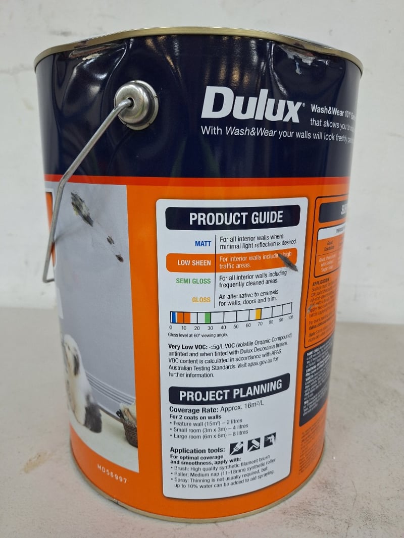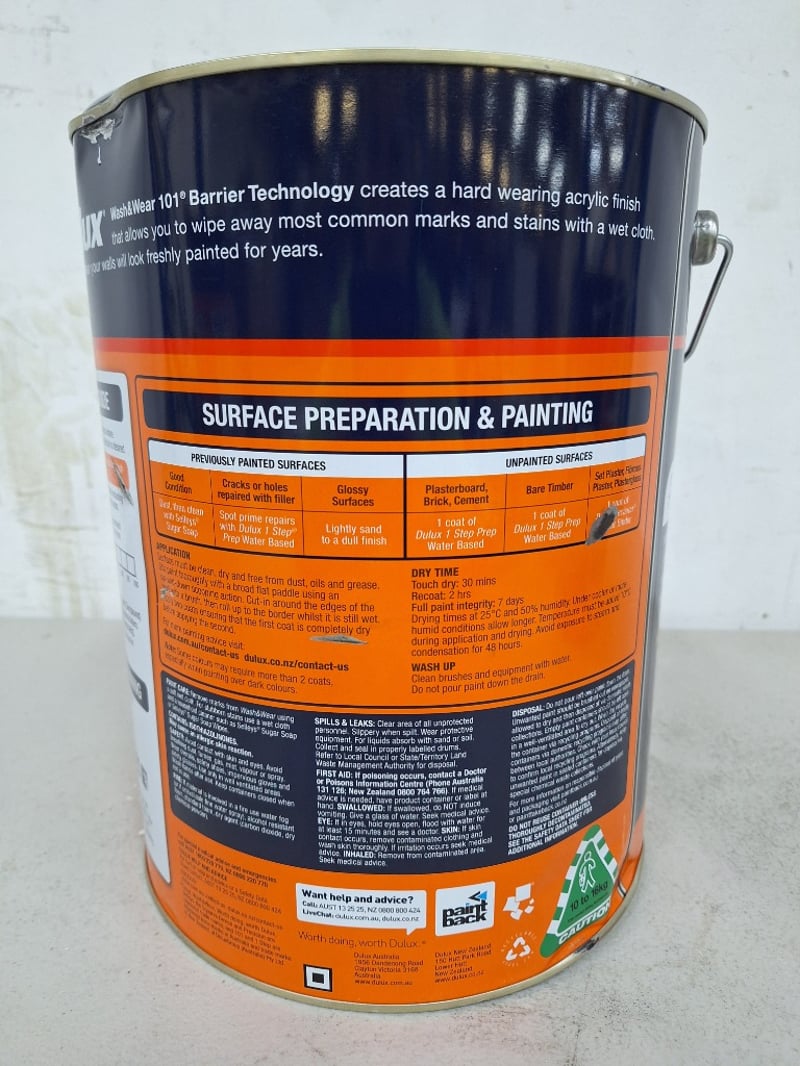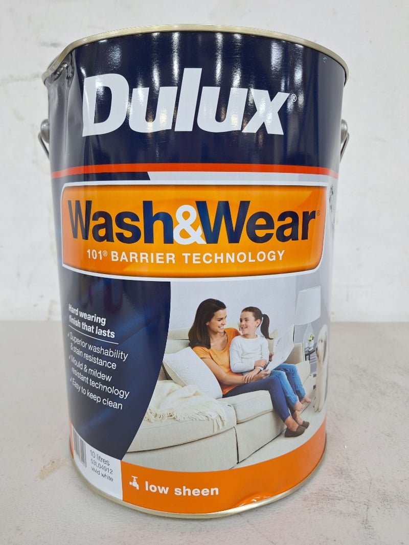 Paint, Dulux Wash & Wear 101 Barrier Technology, Low Sheen, Vivid White 10LBID PER LITRE, BID MUST TAKE 10 LITRES