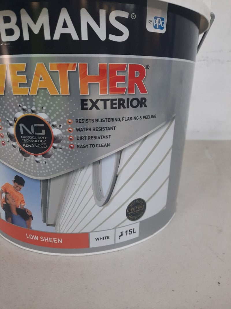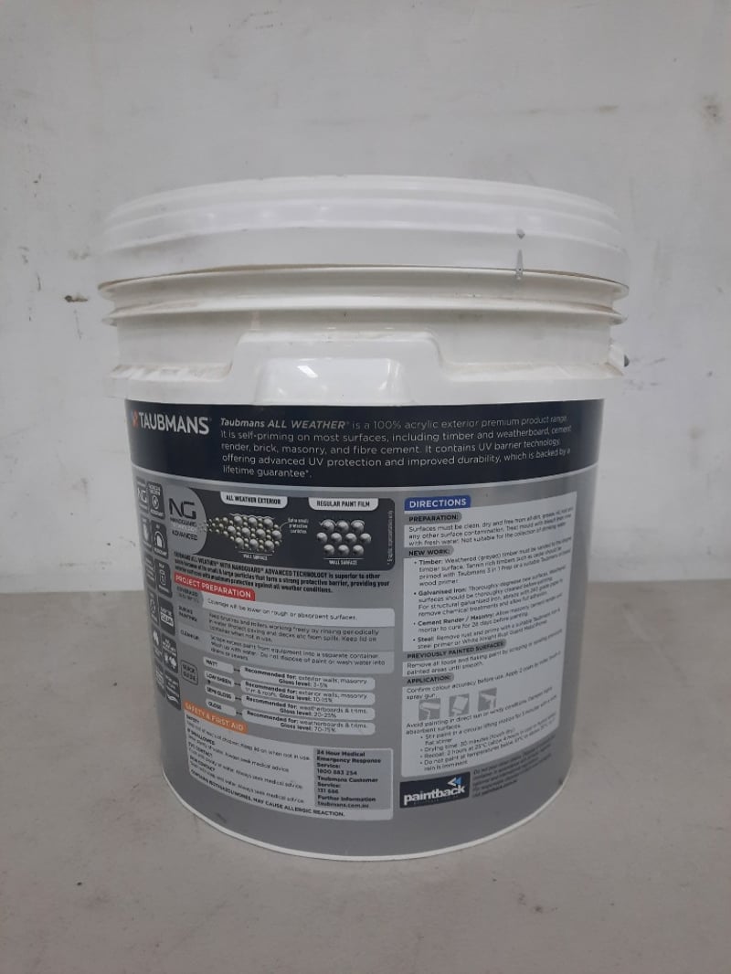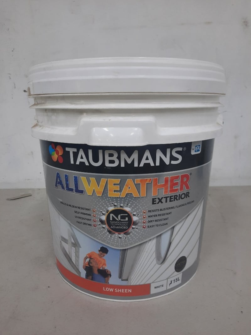 Paint, Taubmans All Weather Exterior, Low Sheen White 15 Litres