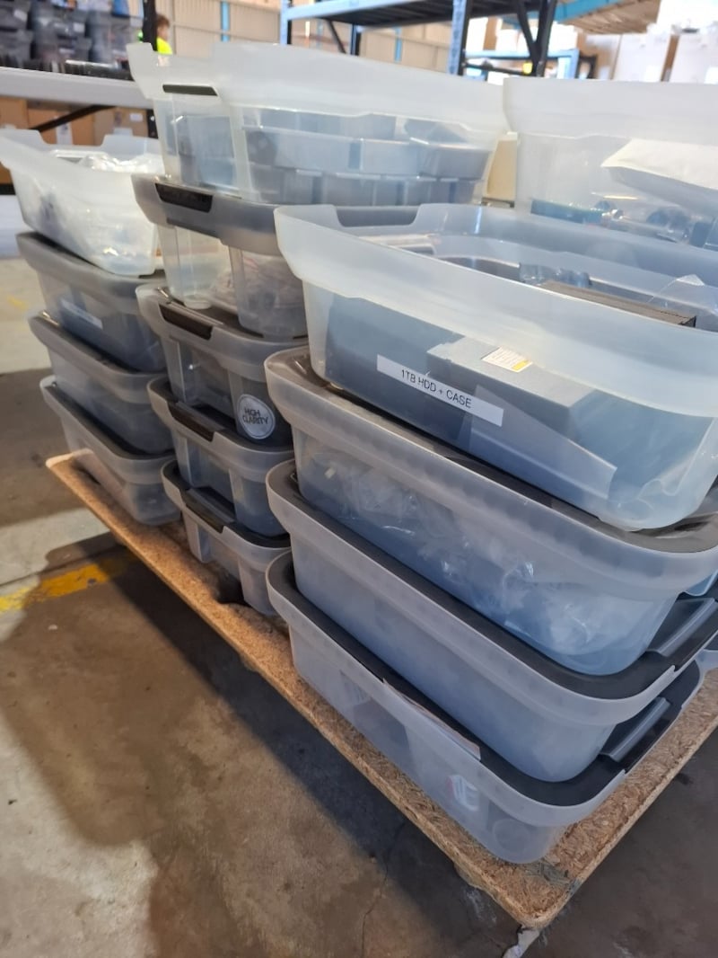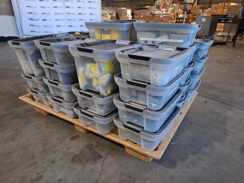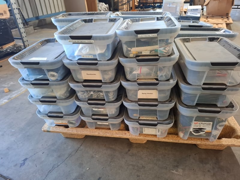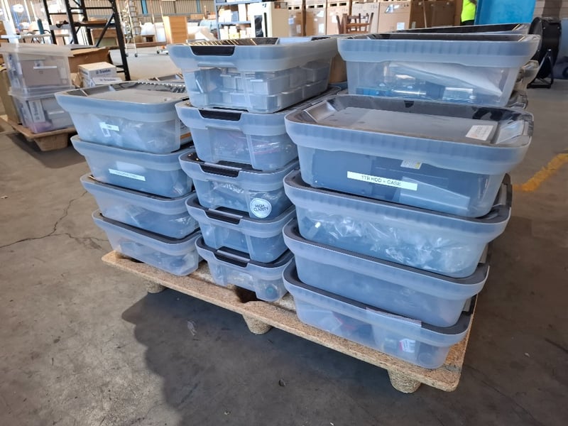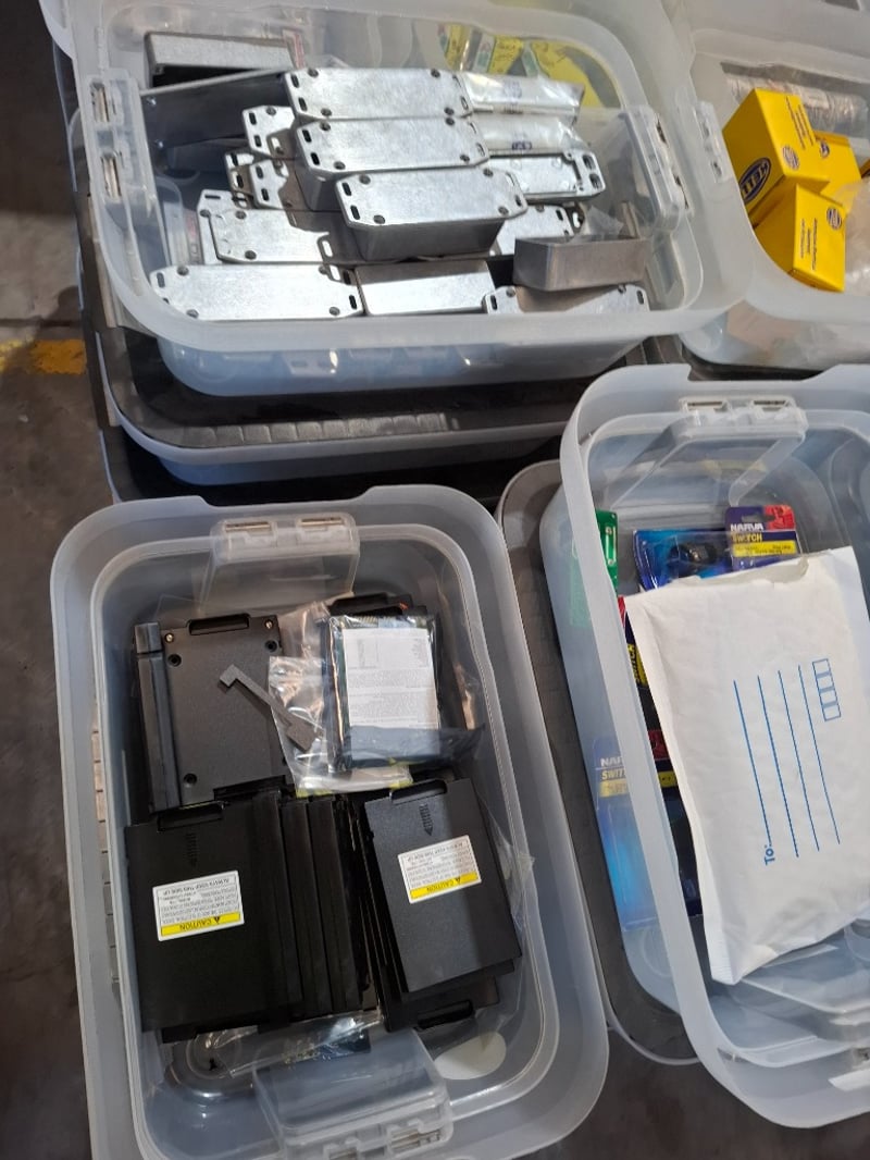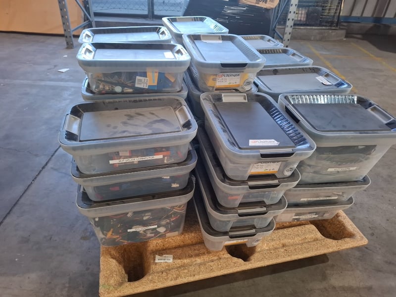 Assortment pallet of container contain electronic parts and accessories for Trimble devices