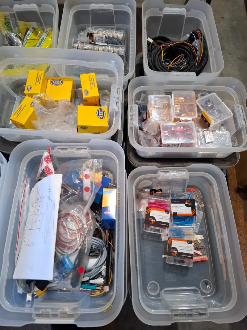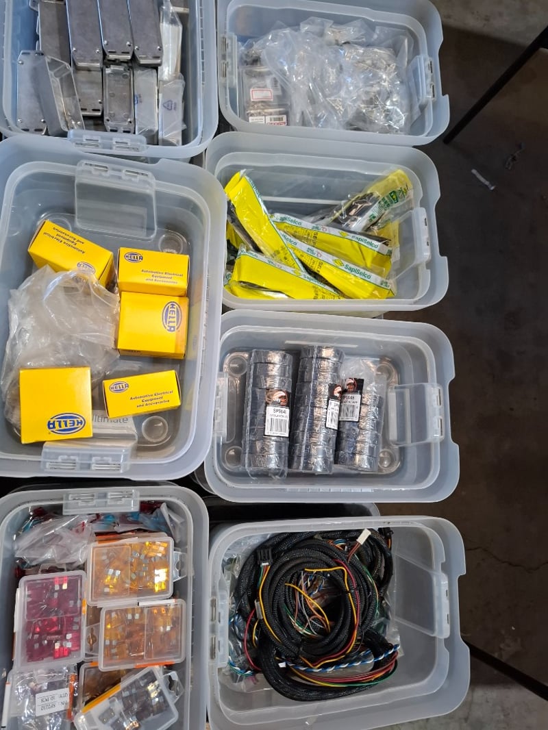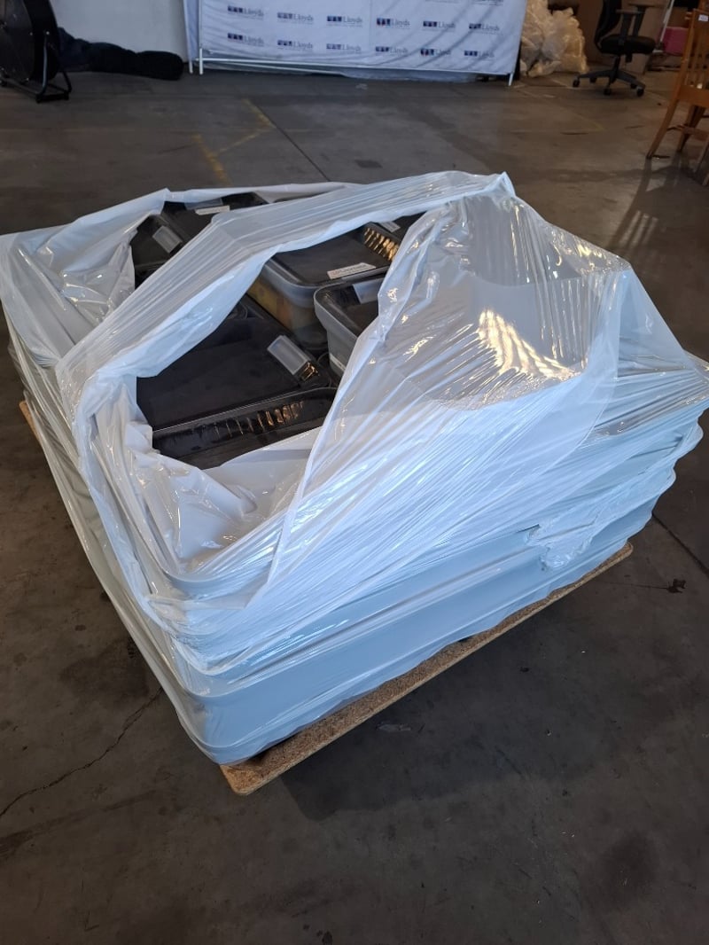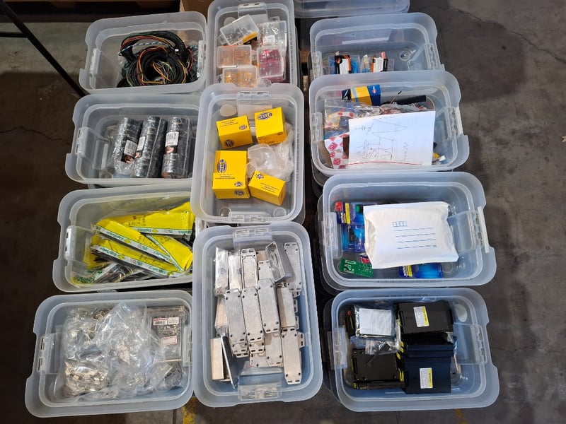 Assortment pallet of container contain electronic parts and accessories for Trimble devices