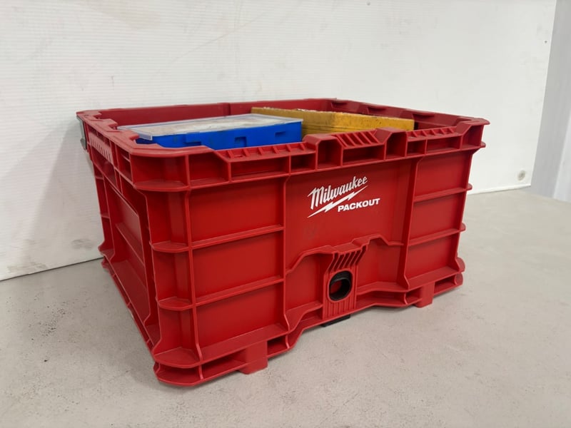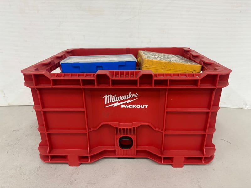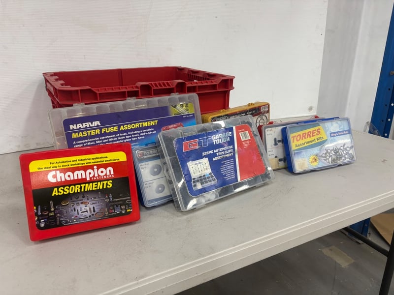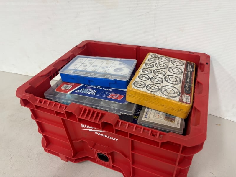 Assorted Lot of Automotive and Electrical Parts, Parts such as Fastener Sets, Trim Clips Set, Wing and Dome Nit Sets, 120PC Auto Fuse Assortment Set, Washers, Fuses and Master Fuses and More, Various Brands and Sizes, With Milwaukee Packout Crate