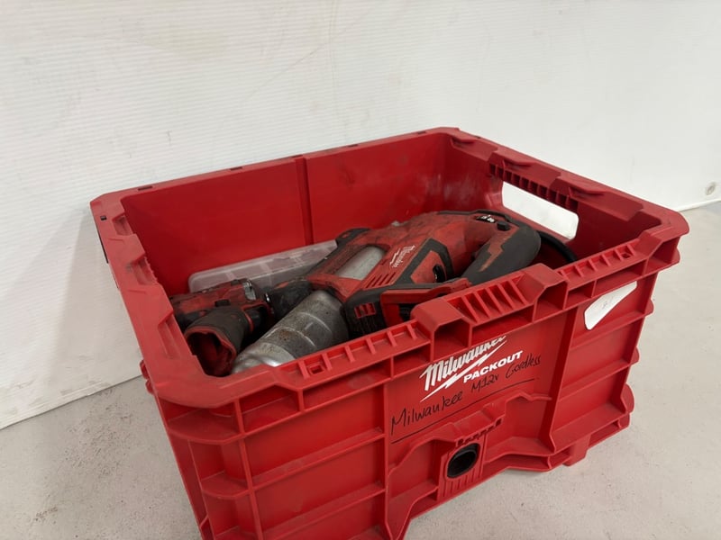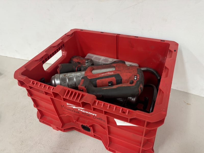 Assorted lot of Hand Power Tools, Brand: Milwaukee, Tools such as Grease Gun, Impact Driver, Right Angle Impact Wrench, Drill and Sand PiecesCondition: UntestedSold as lot.