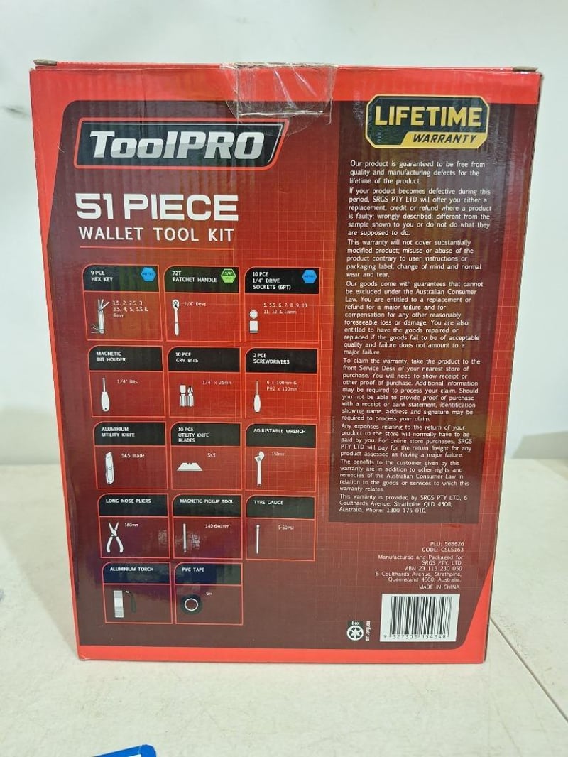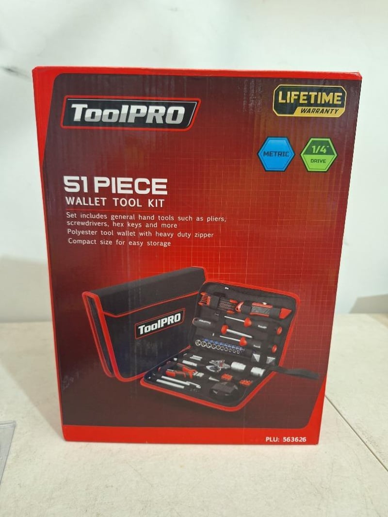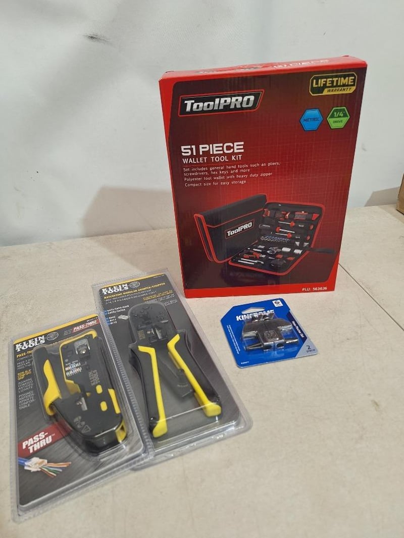 1x TOOLPRO 51 piece wallet tool kit 1/4 drive PLU:563626, RRP $56.99, NEW factory sealed in box1x KLEIN TOOLS ratcheting modular stripper/crimper RRP$ 69, NEW factory sealed in box, 1x KLEIN TOOLS pass-thru modular crimper RRP$ 85.45 NEW factory sealed in box, 1x KINCROME hose pincher set 2 piecem NEW factory sealed in box RRP$ 26.95