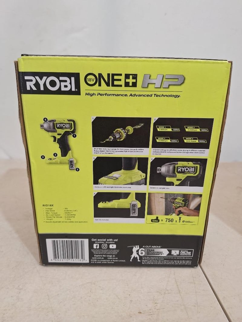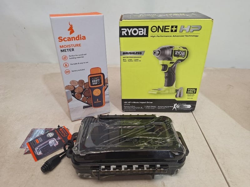 1x SCANDIA moisture meter, RRP $39.99, NEW factory sealed in box, 1x RYOBI one+ HP, 18v, 4-mode impact driver, RRP$159, NEW factory sealed in box, 1x TACTIX water resistant case-s, BUN-320070, NEW