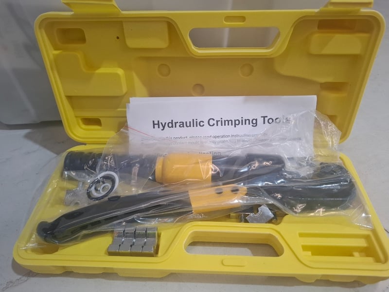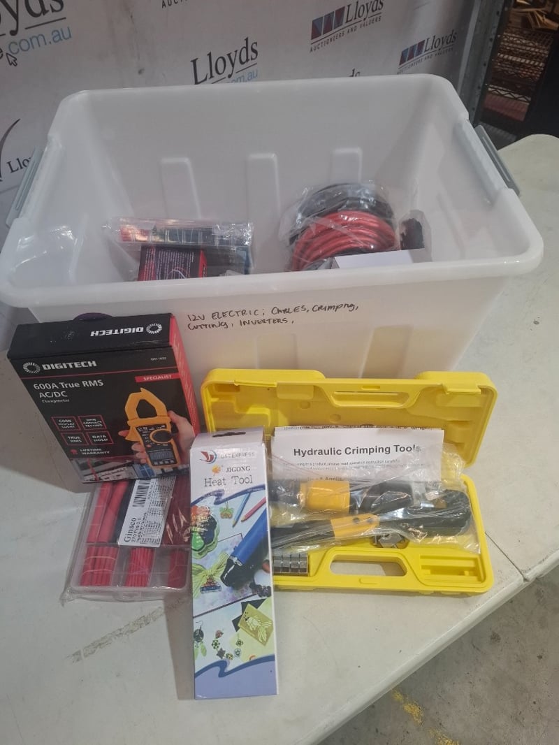 Assorted container of electrical parts including, hydraulic crimping tool, power flow tool, shrink tube and more.NOTE INSPECTION RECOMMENDED