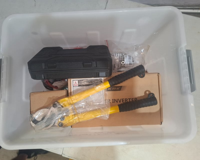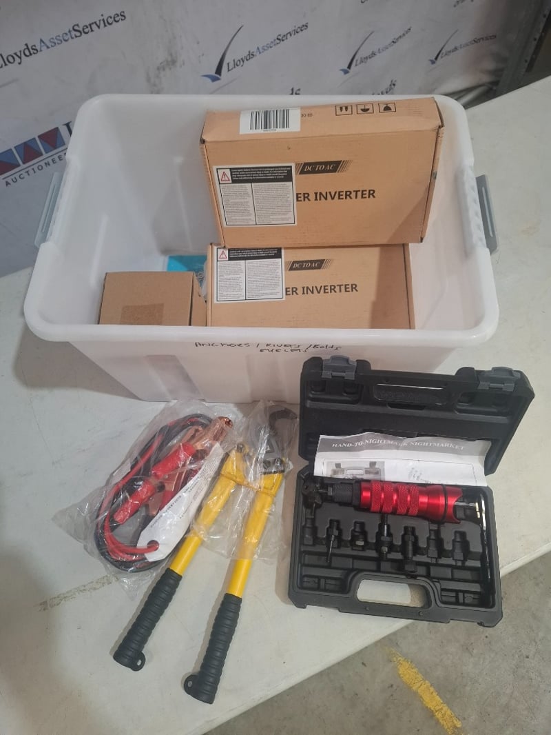 Assorted container of electrical parts including, power inverter, cable cutting tool power leads and more.NOTE INSPECTION RECOMMENDEDSold as lot