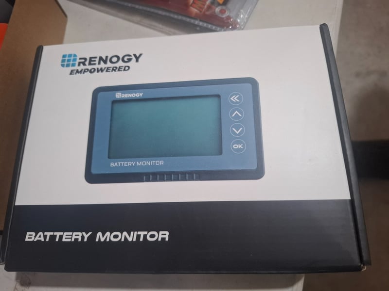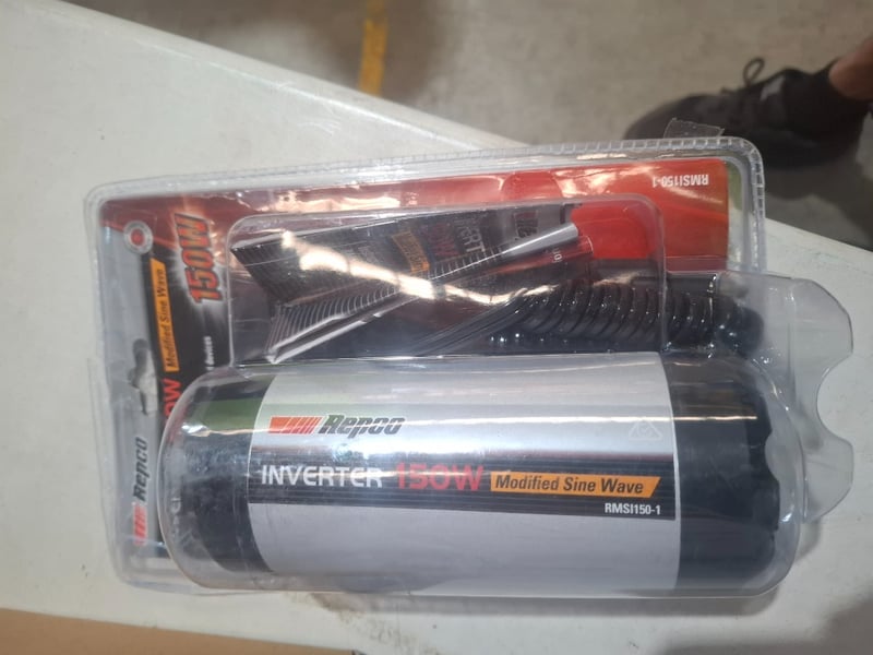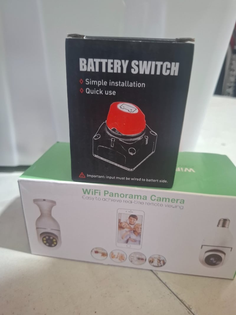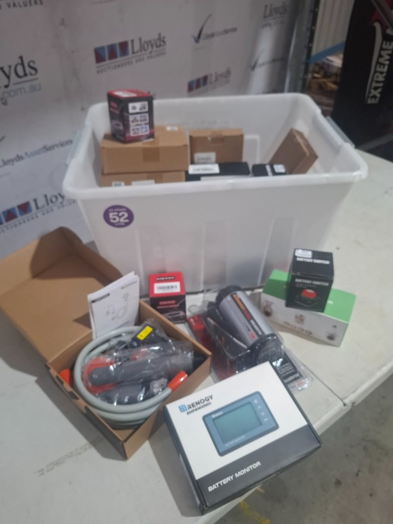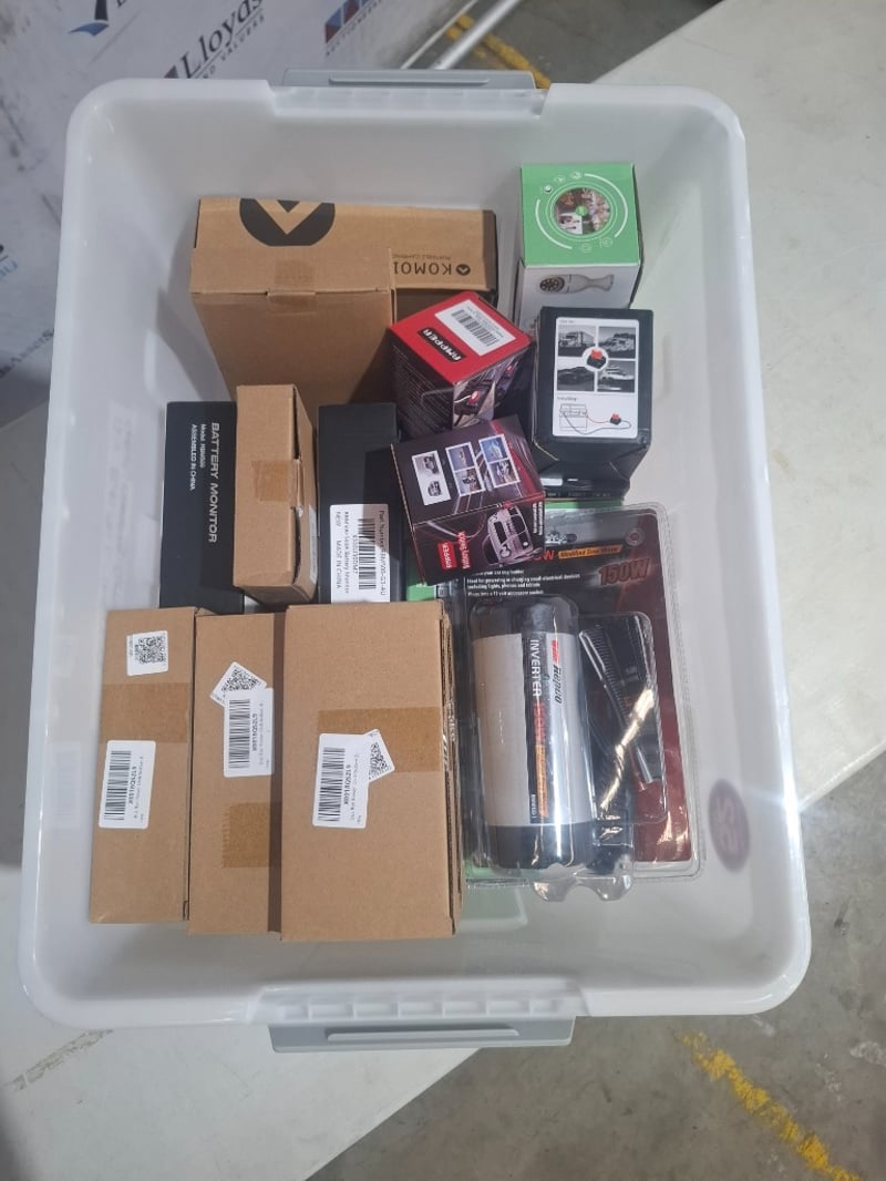 Assorted container of electrical parts including, battery monitor screen, Wi-Fi monitoring cameras, 150 W 240 volt inverter and more.