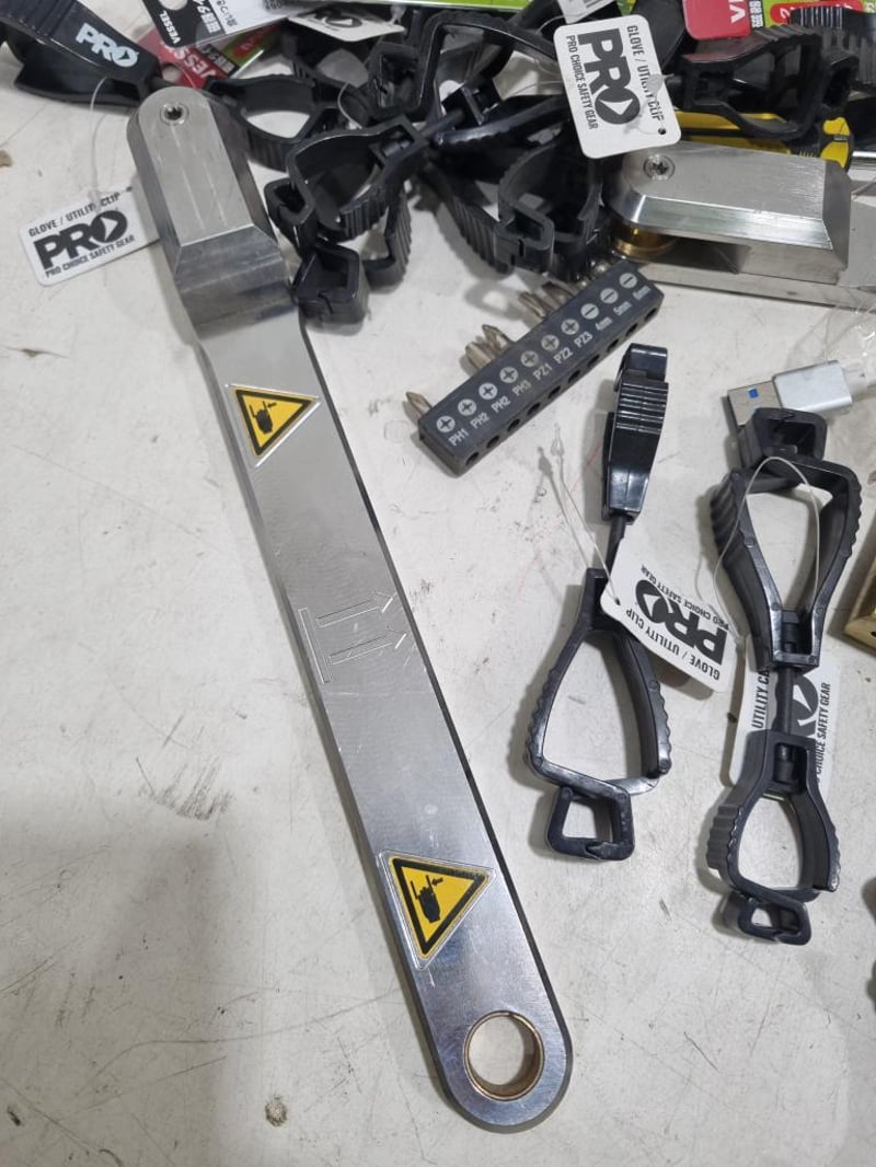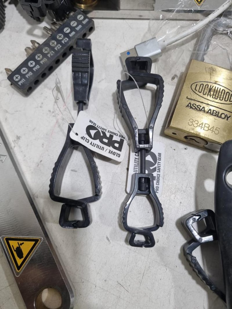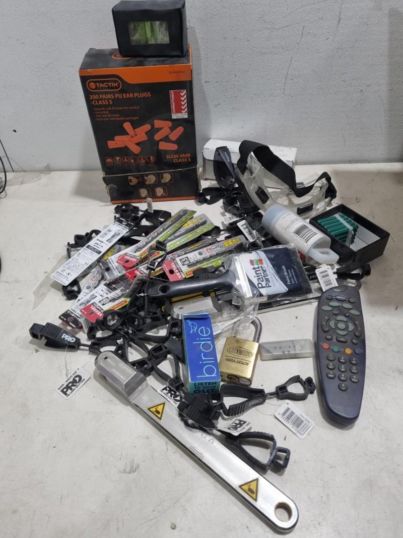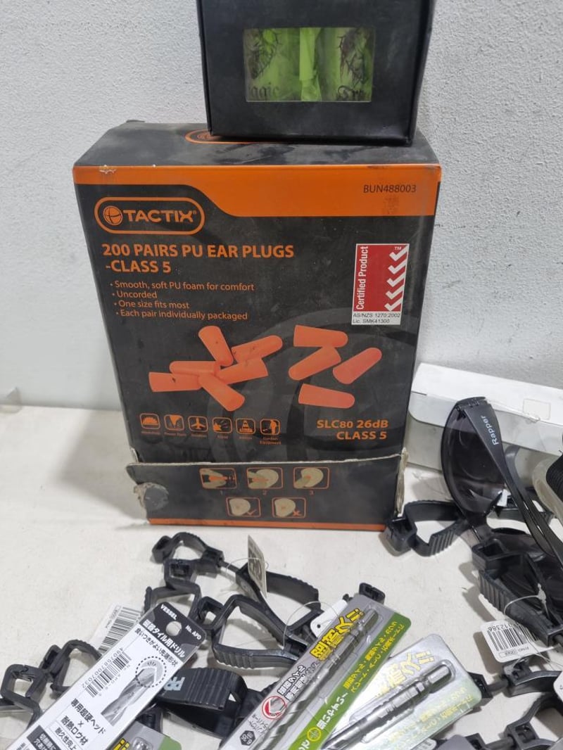Assorted industrial lot, includes ear plugs, gloves utility clips and more ...... Sold as lot