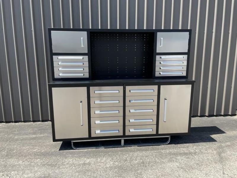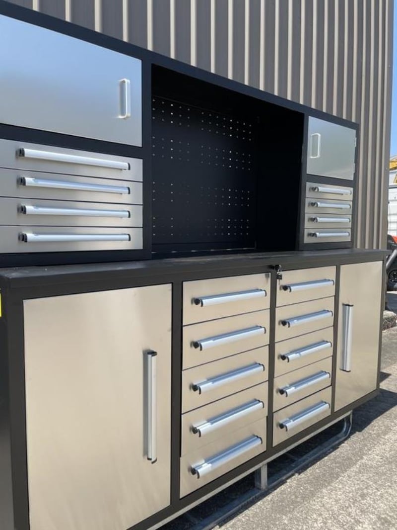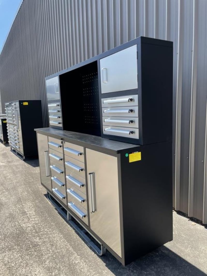 18 DRAWER 7FT TOOL CABINET FEATURES: - Heavy Duty and Full extension - Non – Slip Pre-Cut Drawer Liners - Secure with Lock and Keys Dimensions: 2205mm Long, 1700mm High, 585mm High