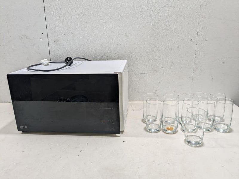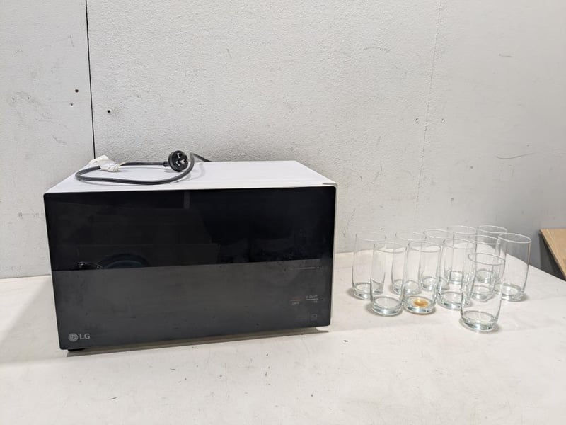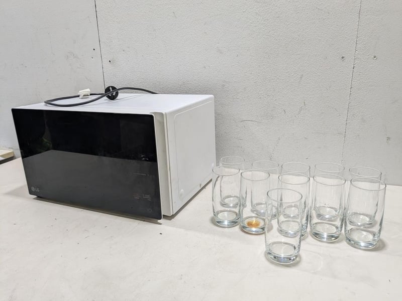 Assorted kitchen items includes, microwave and glass.NOTE: Signs of wear and tear.Sold as a lot.