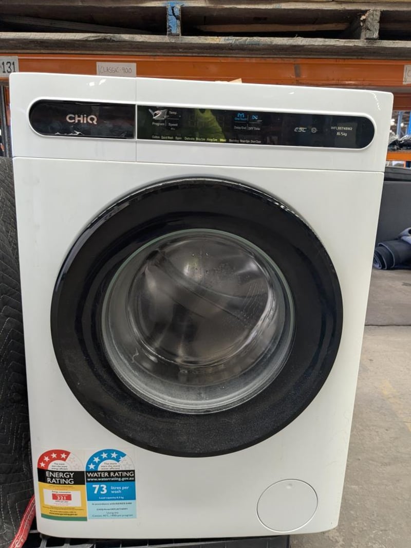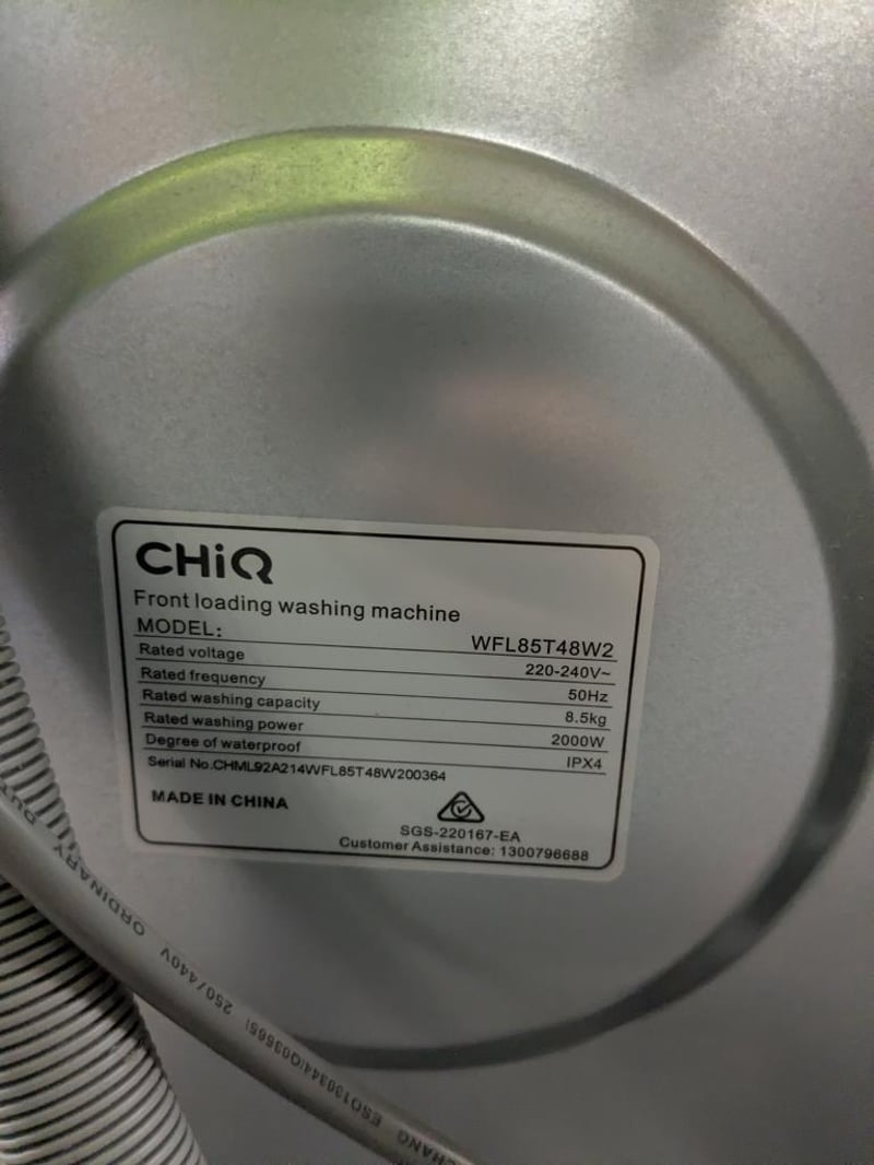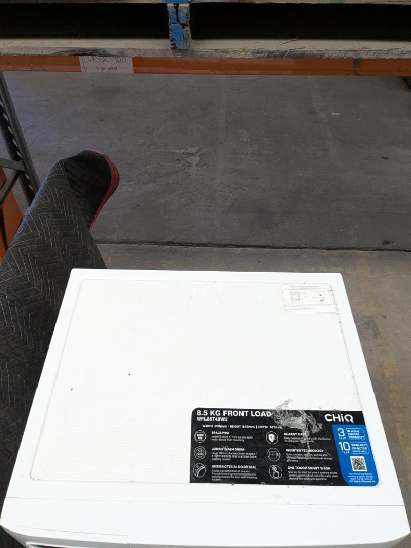 Chiq white washing machin. Model: WFL85T48W2 Serial Number: CHML92A214WFL85T48W200364 Dims: 84cm x 69 x 51cm NOTE: Signs of wear and tear.
