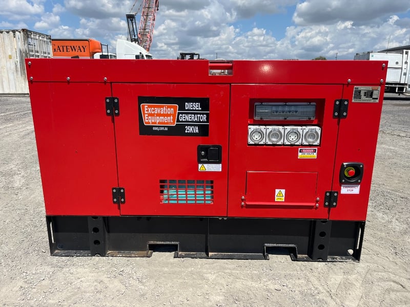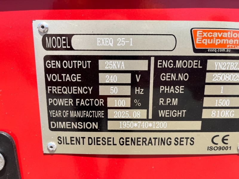 25kva Single Phase Silent Diesel GeneratorsMake: Excavation EquipmentModel: EXEQ 25-1Year: 08/2025Hours: 0.5Serial #: 25080251Gen Output: 25KVAVoltage: 240VFrequency: 50HzPower factor: 100%Eng Model: YN27BZJ30Phase: 1RPM: 1500Weight: 810Dimensions: 1950 X 740 X 1200Description: 4 Cylinder Diesel EngineOutlets: 4 x 32Amp & 4 x 15AmpEmergency Stop, Battery IsolatorFork PocketsLifting pointSound InsulationComes with ManualNot compatible with ATS (Automatic Transfer Switch)Sold as is,Location: 3/263 Connors road, Paget, Mackay, 4070Contact: Bradley Taylor - 0473425094 - [email protected]