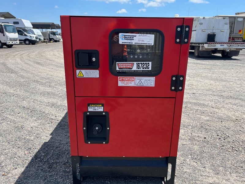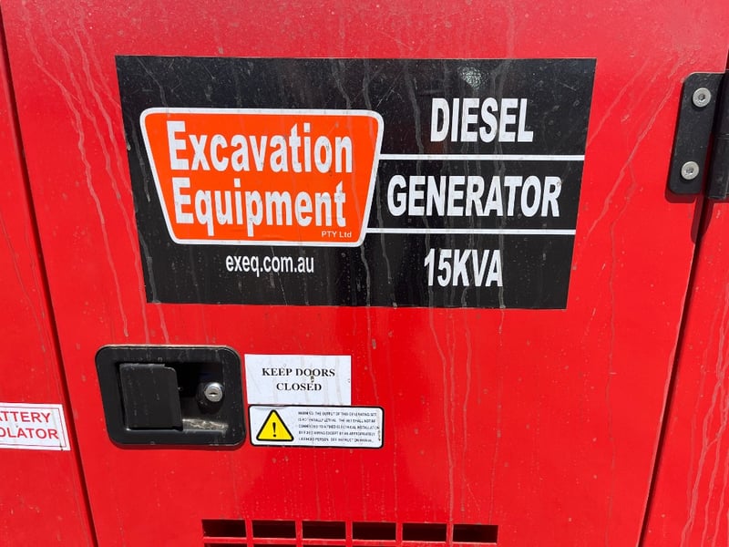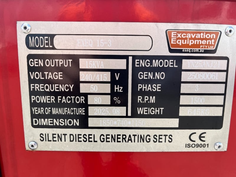15kVA 3 phase type 2 Silent Diesel GeneratorsMake: Excavation EquipmentModel: EXEQ 15-3Year: 08/2025Hours: 0.5Serial #: 25080061Gen Output: 15KVAVoltage: 240/415Frequency: 50HzPower factor: 80%Eng Model: YN25ANJ21Phase: 3RPM: 1500 Weight: 645Dimensions: 1850 x 740 x 1150Description: Cylinder Diesel EngineSingle & 3 Phase OutletsEmergency StopBattery IsolatorLifting pointSound InsulationComes with ManualNot compatible with ATS (Automatic Transfer Switch)Sold as is,Location: 3/263 Connors road, Paget, Mackay, 4070Contact: Bradley Taylor - 0473425094 - [email protected]