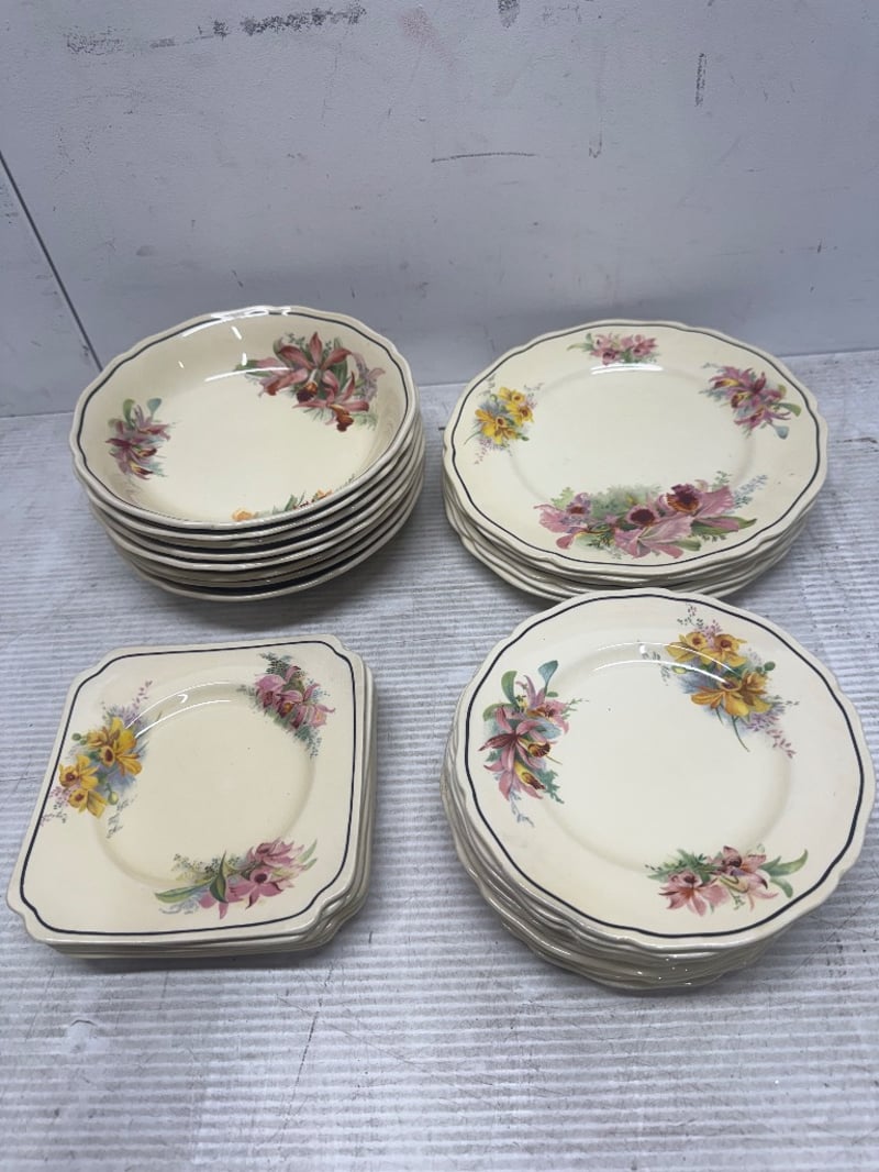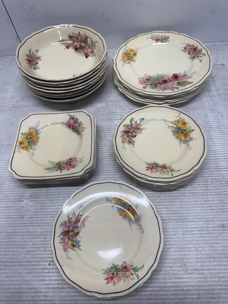 Fine China. Royal Doulton "Orchid". 8 x large bowls. 6 x large plates. 6 x small square plates. 12 x small round plates.