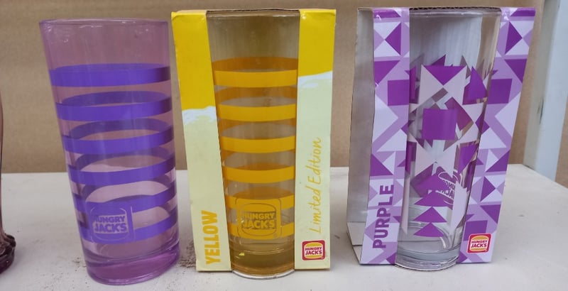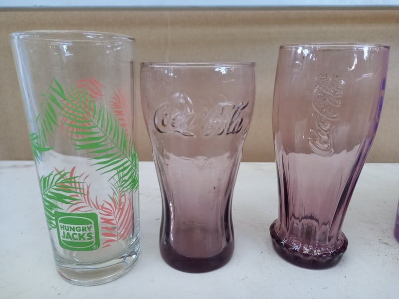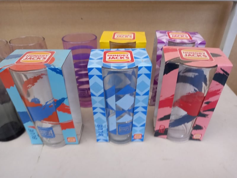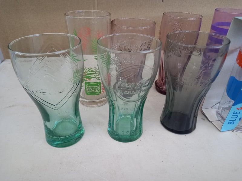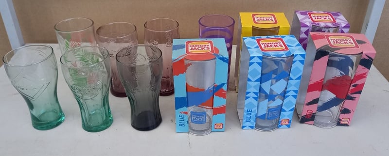 Glassware, Vintage Style Coke Glassware, and Hungry Jack's Collectors Glass Cups Sold as lot