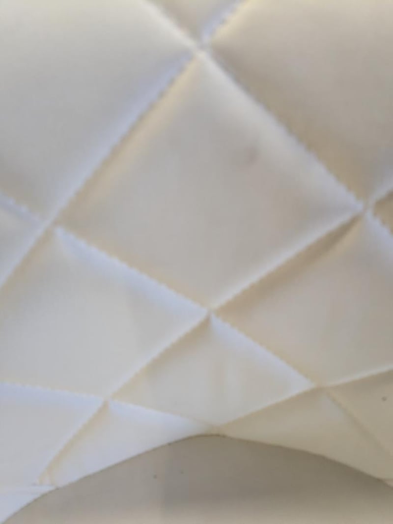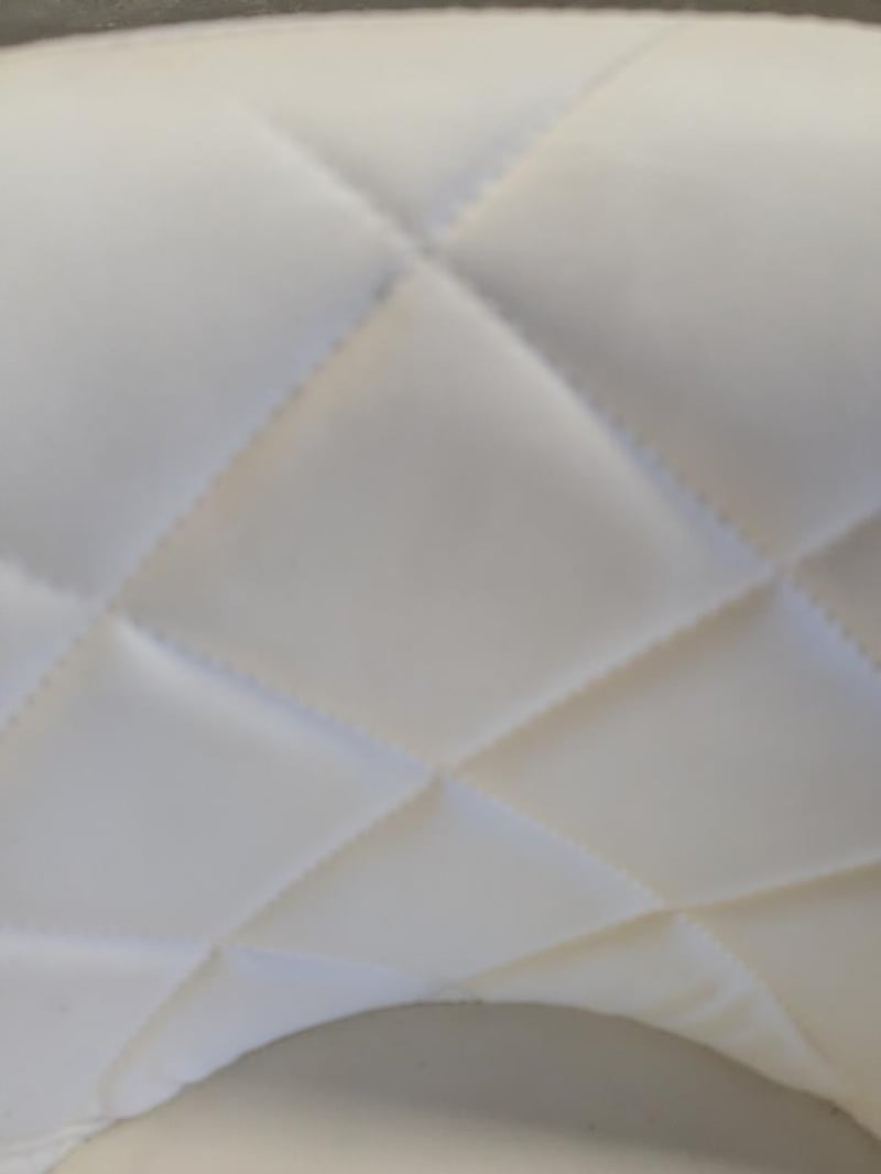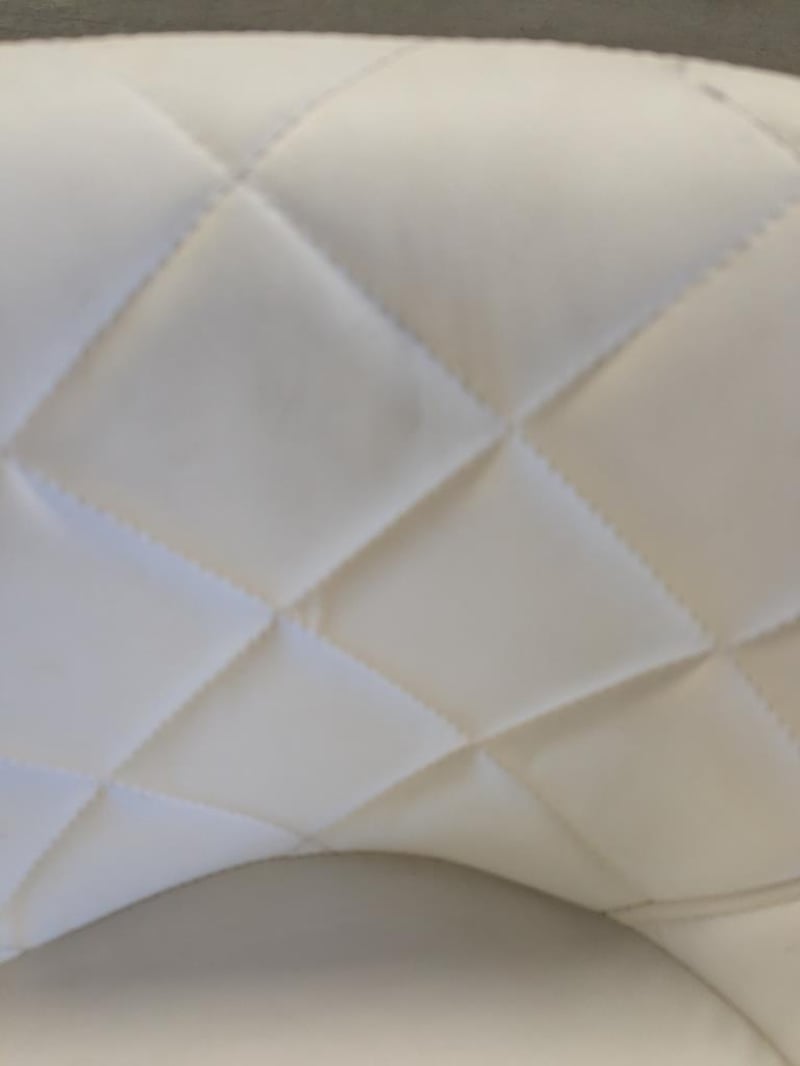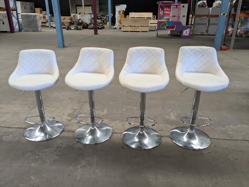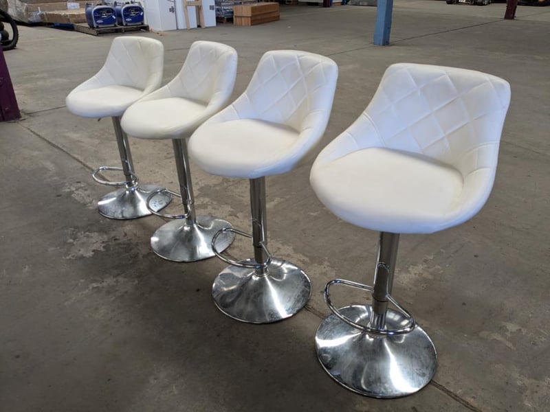 Set of 4 adjustable kitchen chairs with gas lifr, leather-like color white. Dims: 100cm x 45cm x 50cm NOTE: Signs of wear and tear. Sold as a lot.