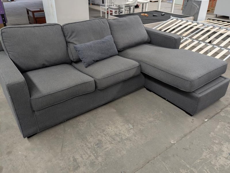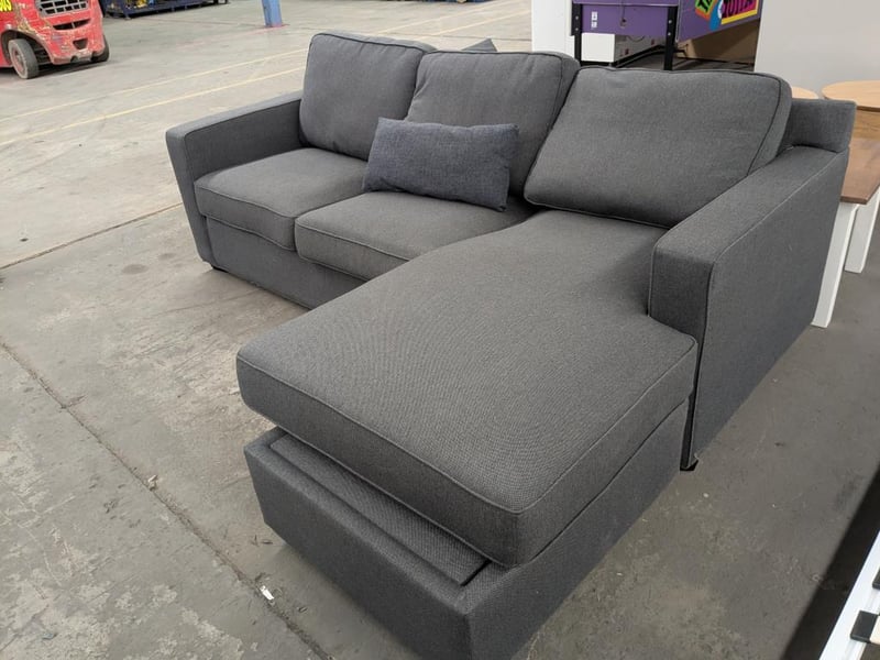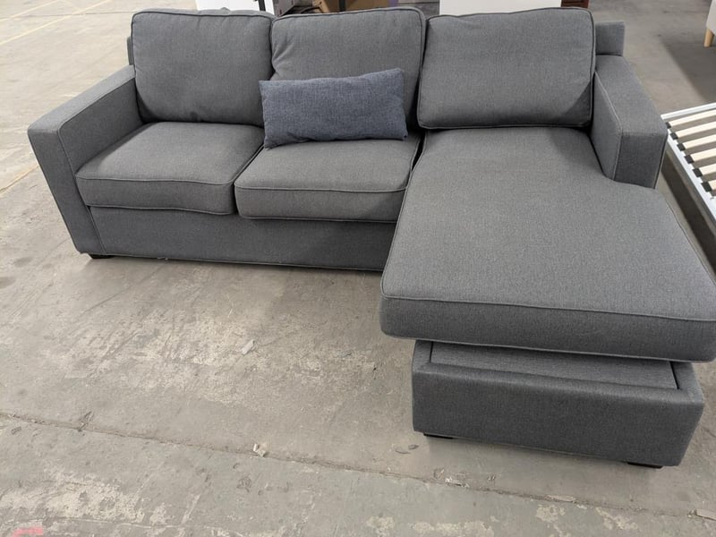 3-seat sofa reversible chaise longue in a grey fabric cover. Dims: 60cm x 207cm x 170cm NOTE: Signs of wear and tear. Sold as a lot.