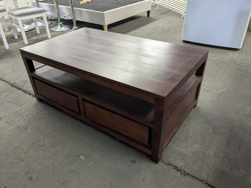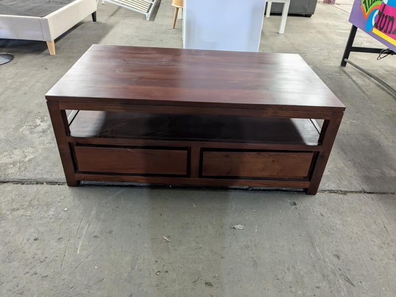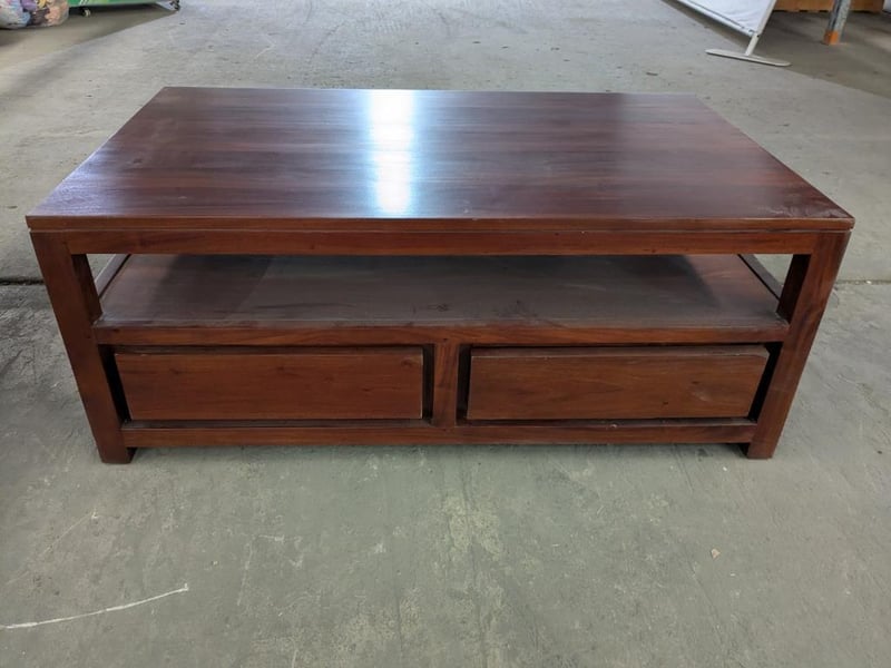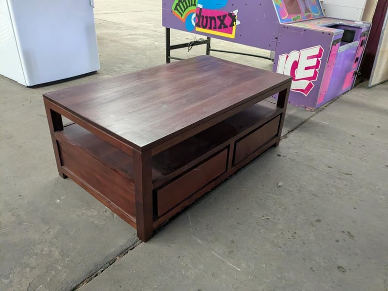 Doble side dark tiember table.Dims: 48cm x 120cm x 70cmNOTE: Signs of wear and tear.