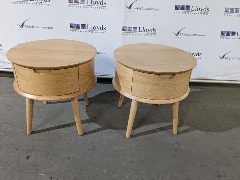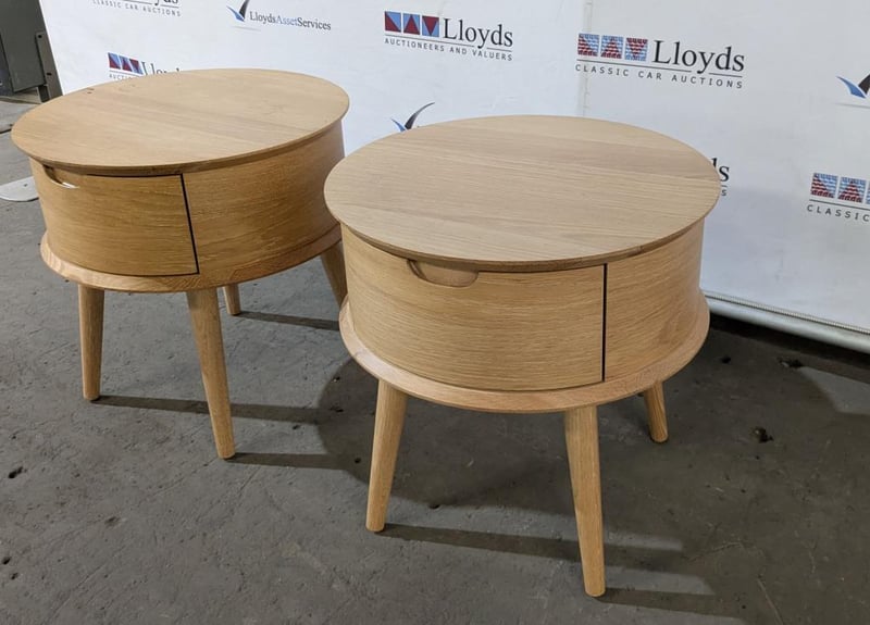 Set of round timber side tables. Dims: 50cm x 50cm x 50cm NOTE: Signs of wear and tear. Sold as a lot.
