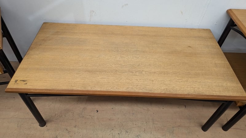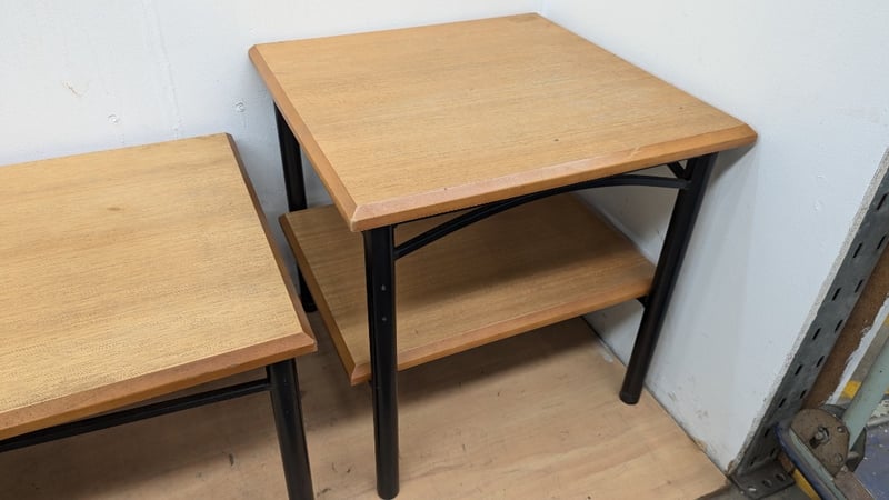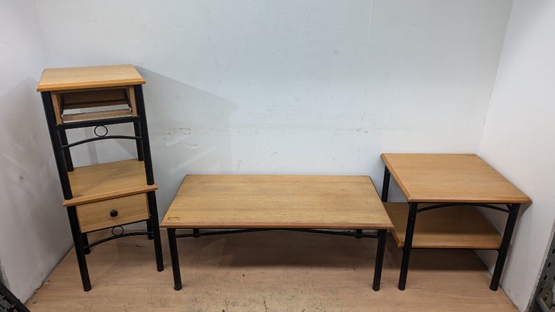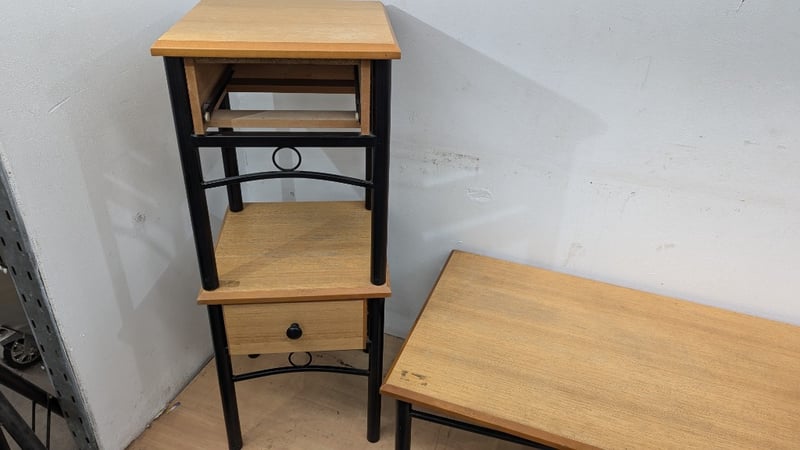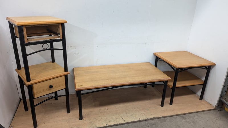 Assorted Tables, Includes Coffee Tables, Two Sizes, Bed Side Tables with Drawers, Metal Frames with Timber Top, Dimensions Ranging From 46cm(H)×120cm(W)×60xm(D) to 58cm(H)×45cm(W)×45cm(D) Quantity 4 Note: One Bed Side Table Missing Drawer Sold As Lot