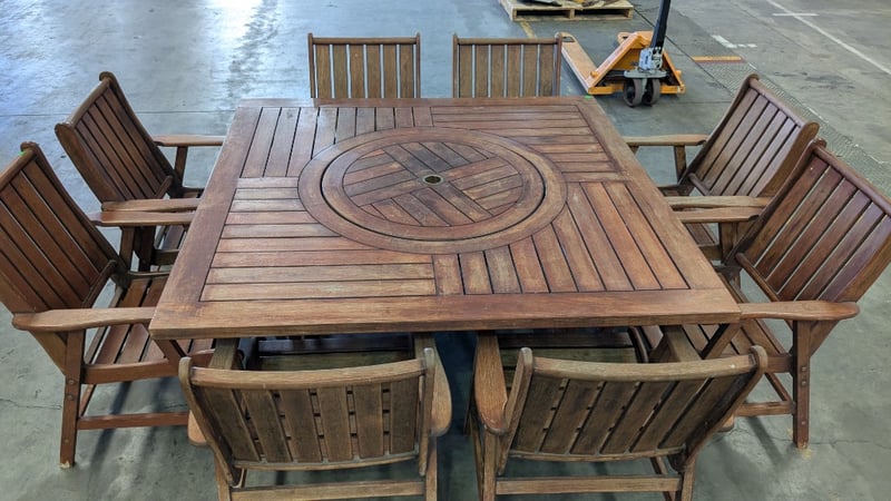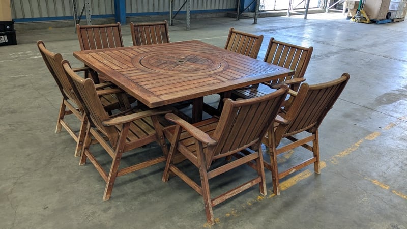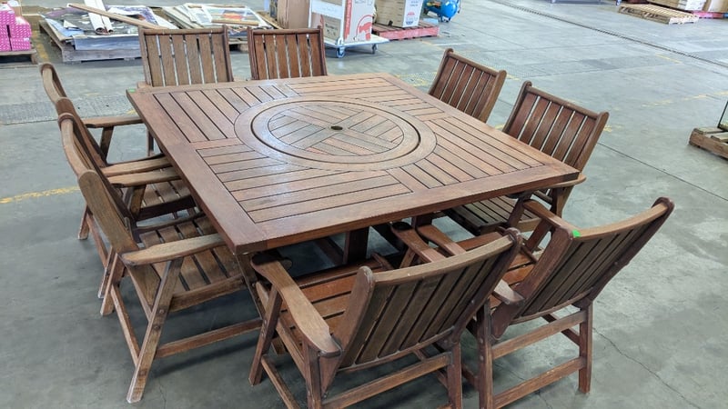 Outdoor Dining Bundle, Includes Square Timber Table with Lazy Suzane, 8 x Timber Dining Chairs