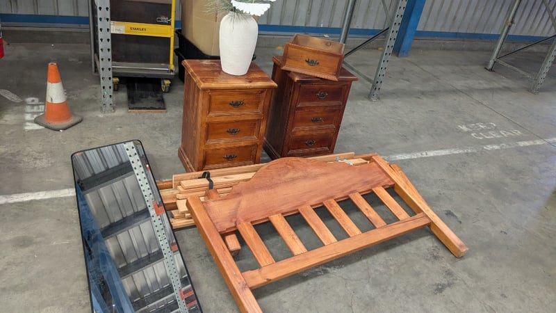 Bedroom Bundle, Includes Vertical Mirror, 2 x Bed Side Table, and Complete Bed Frame Unknown SizeSOLD AS LOTNOTE: NO SCREWS, INSPECTIONS HIGHLY RECOMMENDED