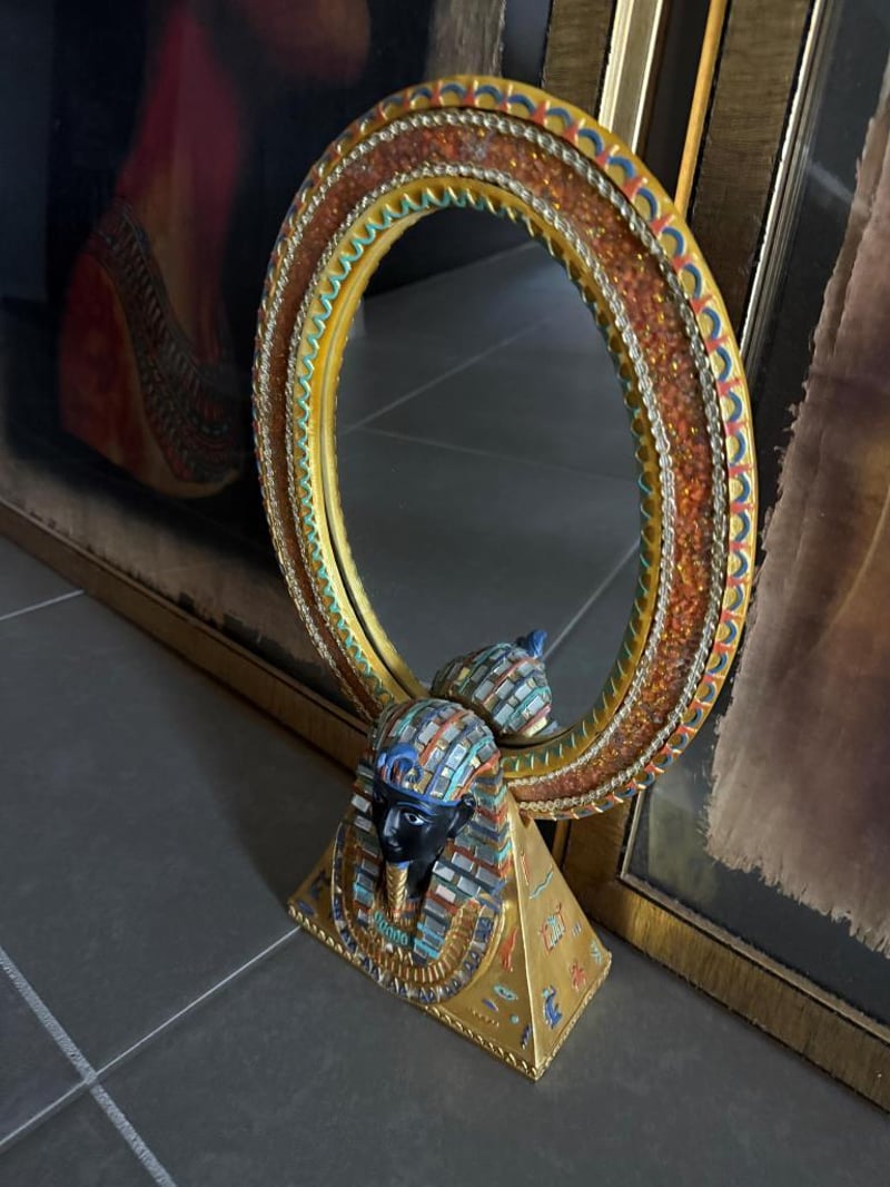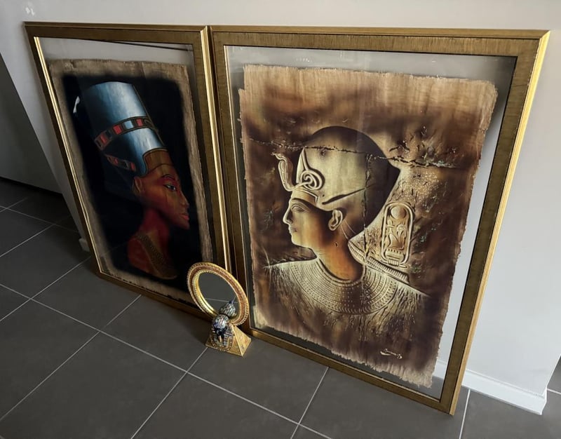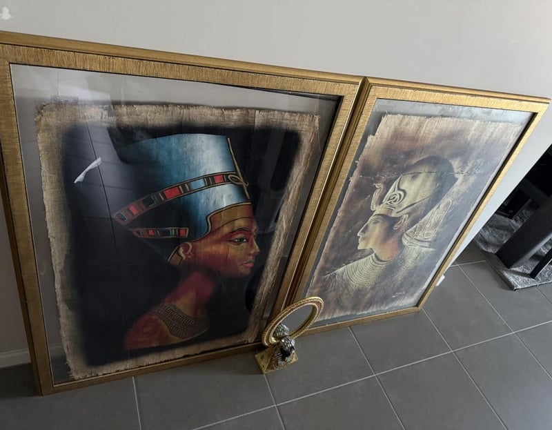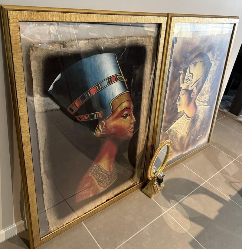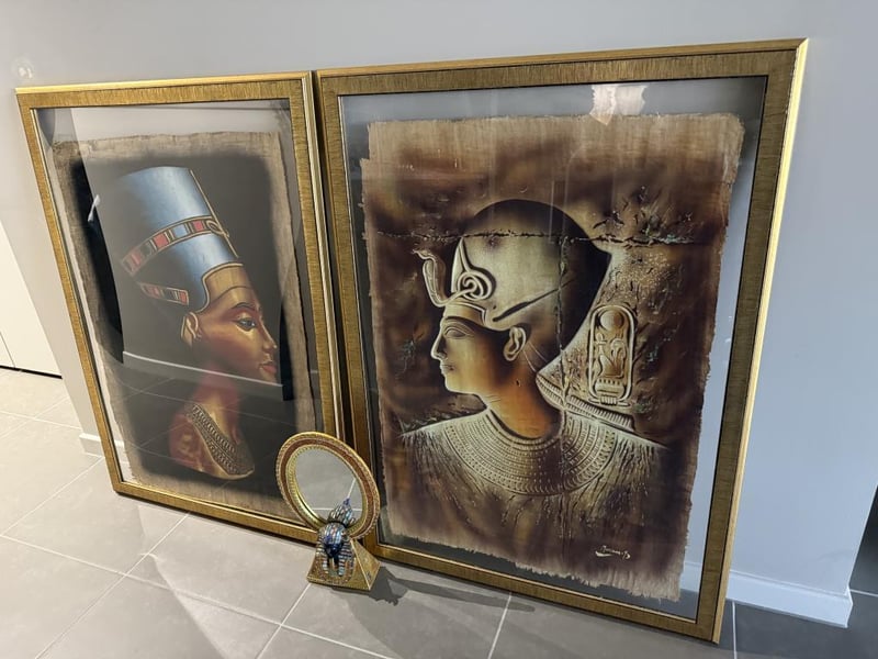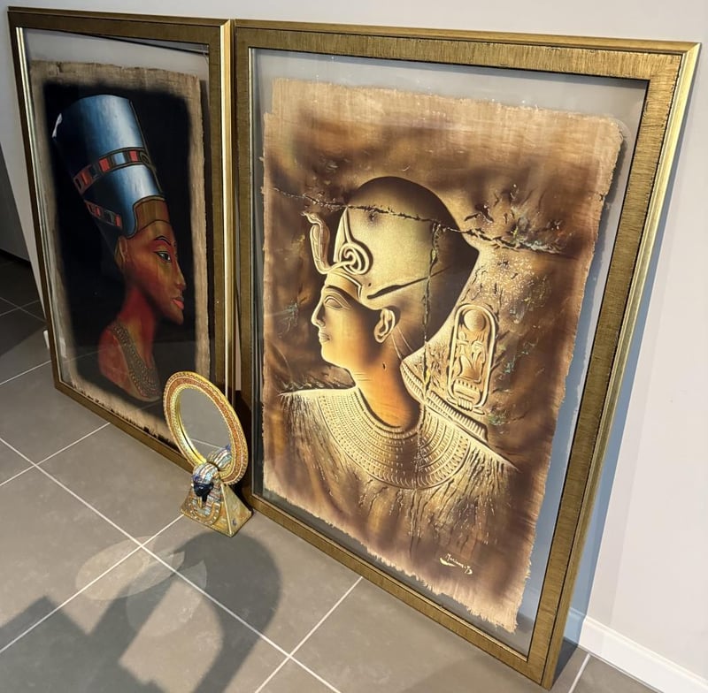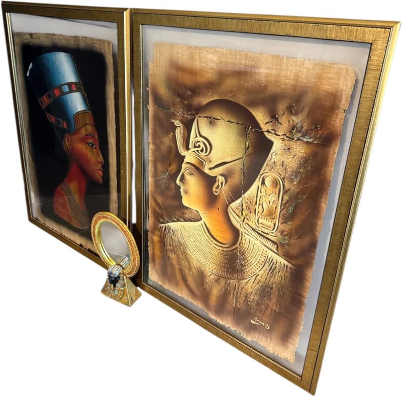 Large Ancient Egypt Pharaoh Papyrus Framed Paintings With Egyptian Mirror NOTE: CRACK ON ONE FRAME CORNER