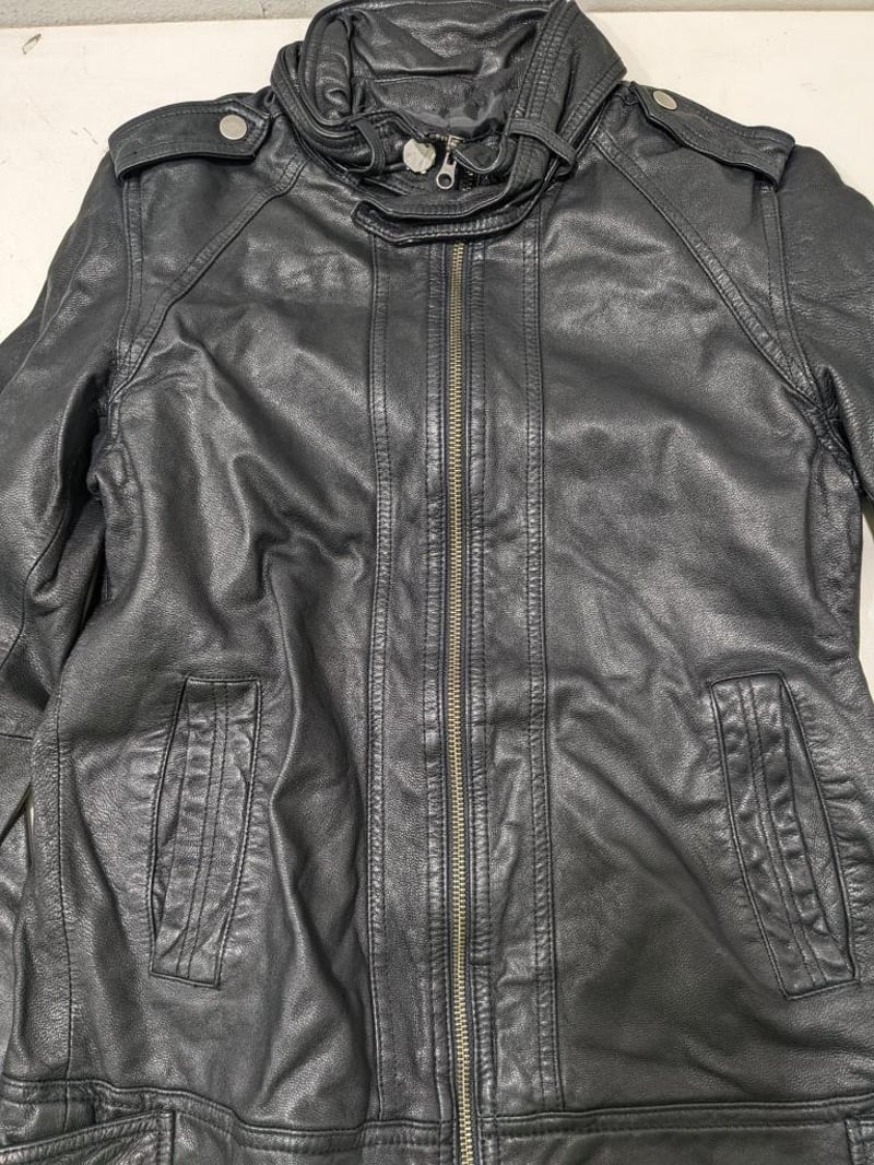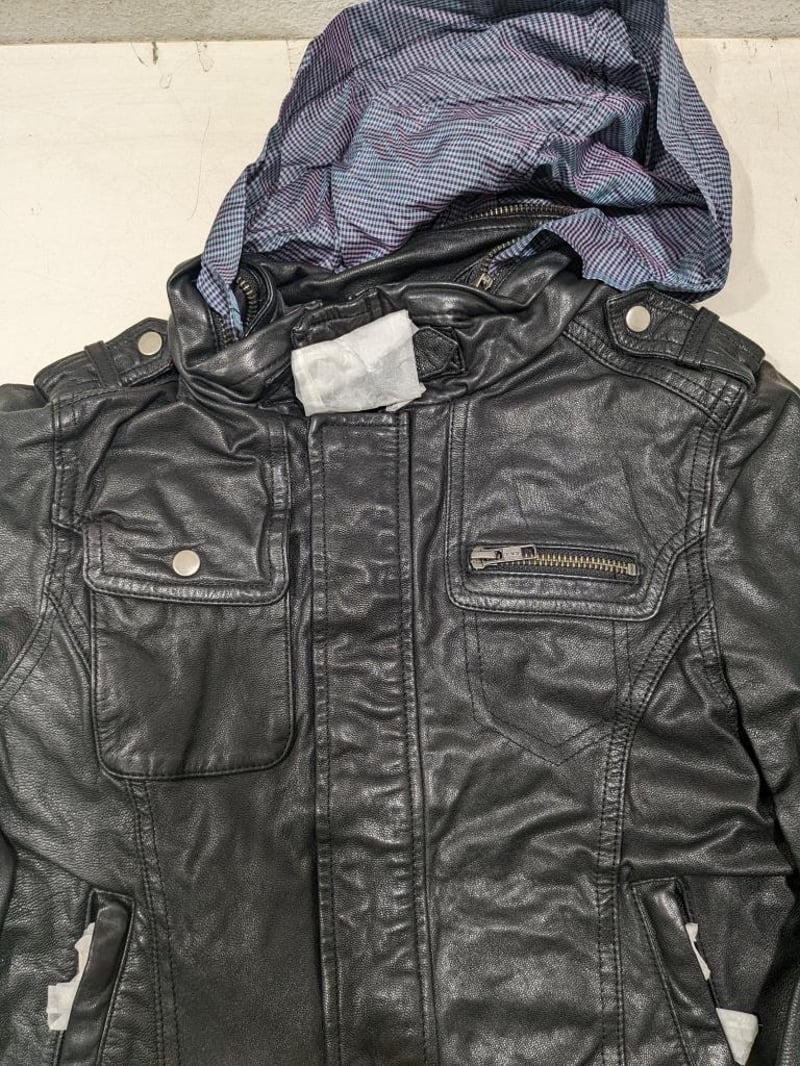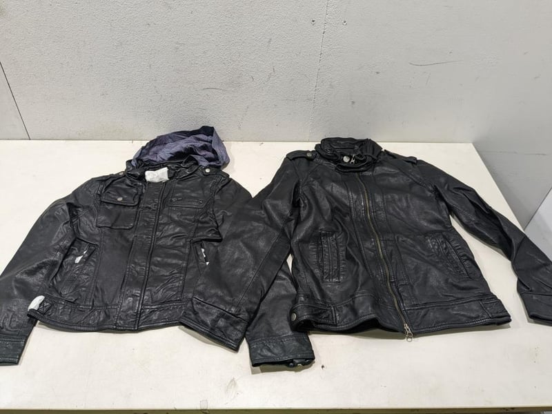 Assorted leather-like jackets different sizes and types. Sold as a lot.
