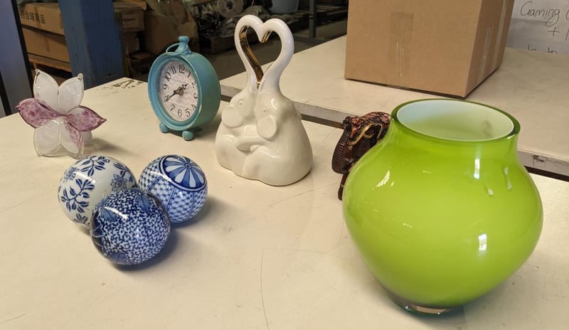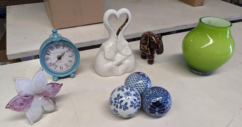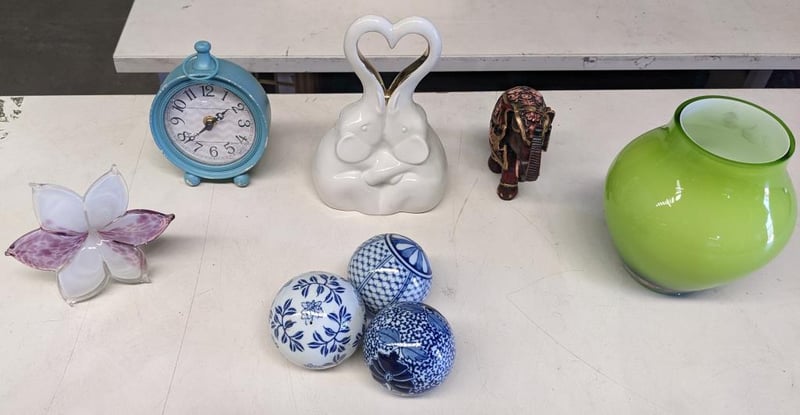 Assorted decoration items includes, ceramic love elephants, ceramic white and blue balls and more.. NOTE: Signs of wear and tear. Sold as a lot.