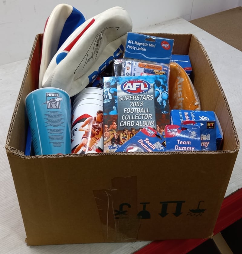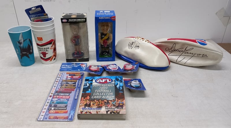 Footy Items, including AFL collectible bobble heads, AFL team dummy's, 2003 football collectors card album, with cards and more Sold as lot