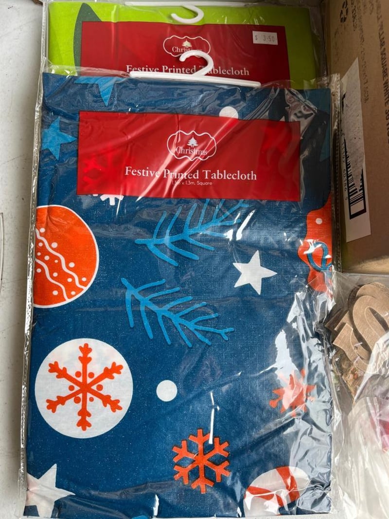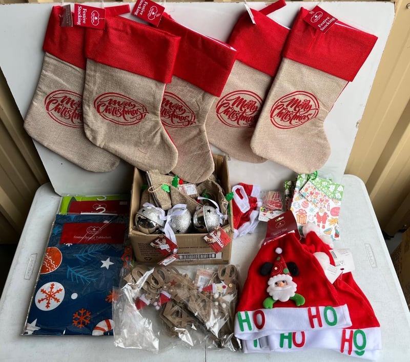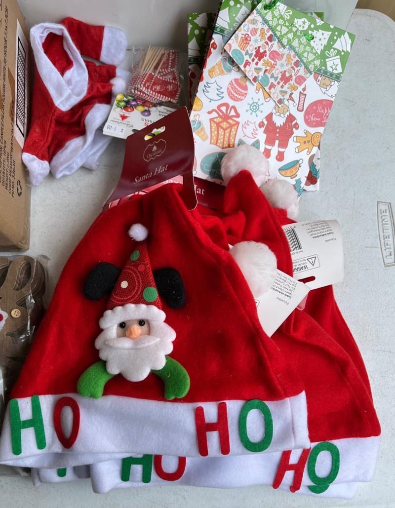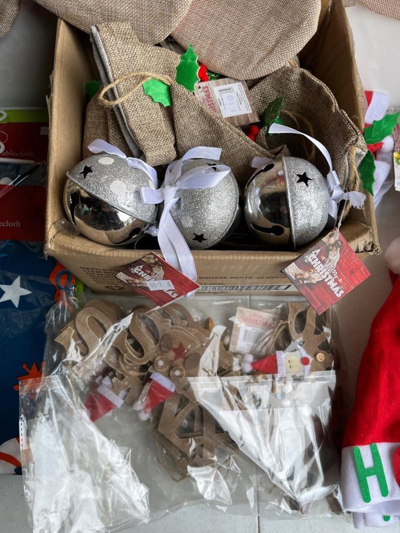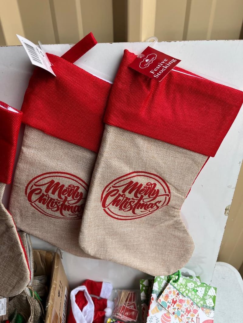 Box of Christmas Stock, Including Santa Hats, Quality Heshian Stockings, Door Hangers, Hesian Hat and Stocking Ornaments, Metal Bells, Table Cloths and more SOLD AS 1 LOT