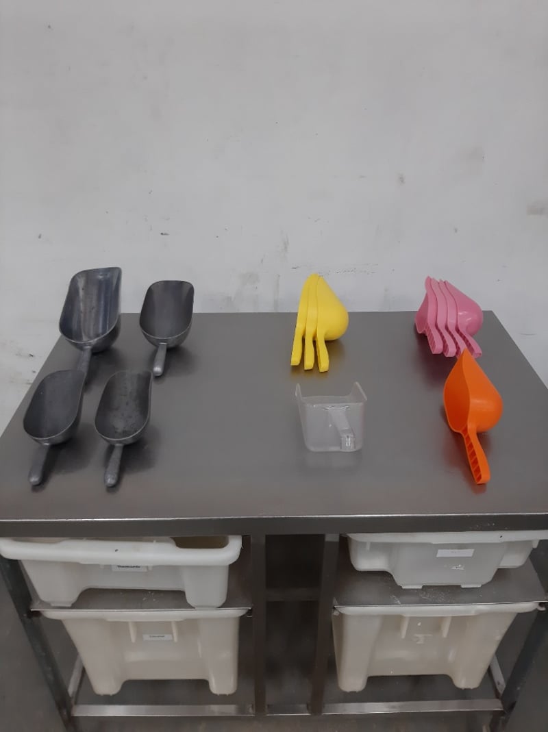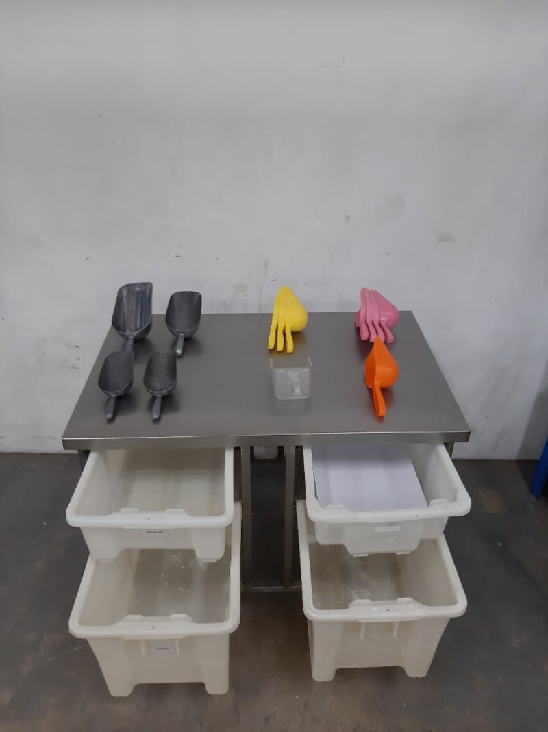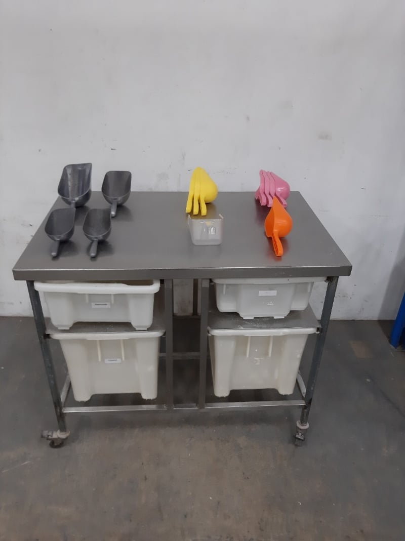 Commercial Kitchen Food Preparation Table, S/Steel On Wheels With 4 Draws Along With Mixed S/Steel / Plastic Baking Scoops Dimensions: 70L x 110W x 91H