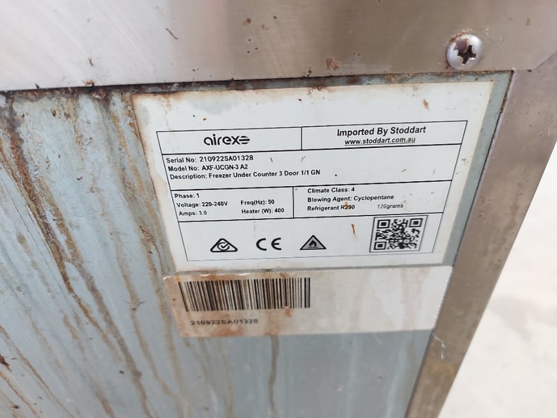 Undercounter Freezer, Airex, Model AXF-UCGN-3 A2, 3 Door, 240V, Stainless Steel, Dimensions 90cmH×179cmW×70cmD