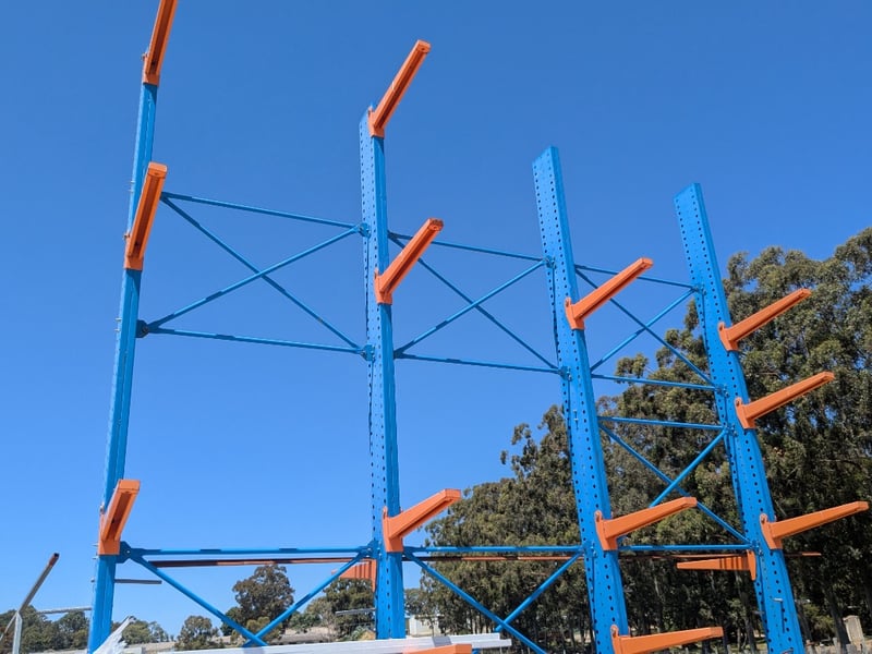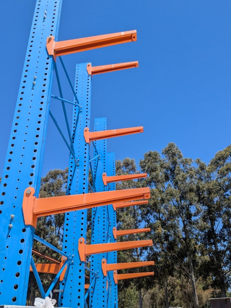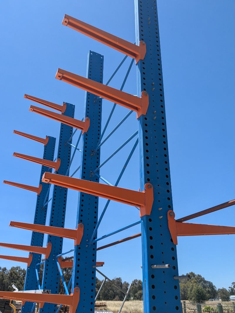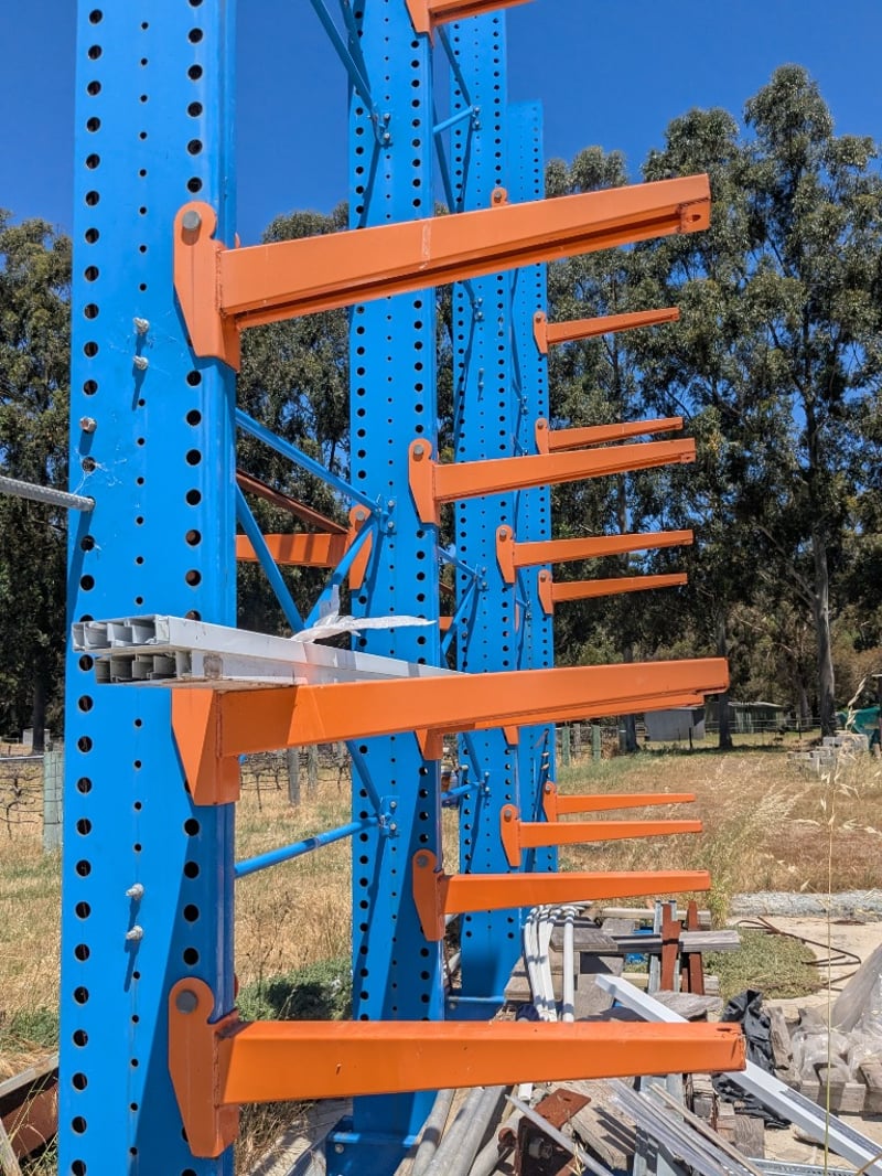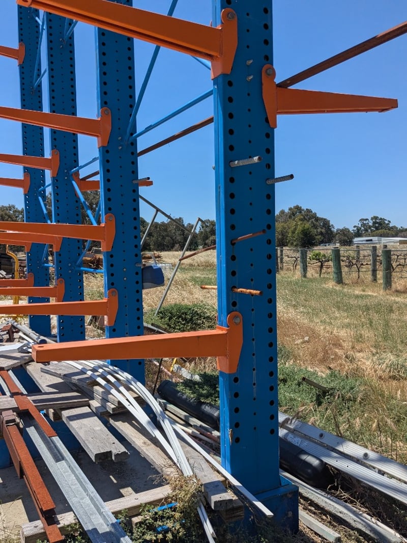 Canter-Lever, Heavy Duty Rack System, 6 Shelf Blue & Orange Customized for Steel Racking or Materials of Length, Onsite Inspection Recommended, Refer To Images Overall Approximate Dimensions: 120cm x 800cm x 400cm Qty 1: Racking System