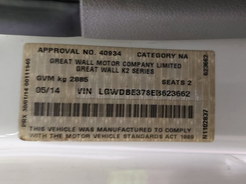 2014 GWM V200 K2 Year: 2014 Make: GWM Model: V200 Series: K2 Body: Single Cab Chassis Drive Type: Four wheel drive Odometer: Indicating 154,888 Kilometers Engine: 2.0 Diesel Transmission: 6-Speed Manual Colour: White Seats: 2 Description/extras: Air Conditioning, Power windows, SRS, Towbar, CD player. Paint peeling & Damages noticed. Wear & tear throughout - REFER TO PHOTOS Price Guide - $4,600 - $6,100 (Based on Unmodified Vehicle) VIN: LGWDBE378EB623662 ENG No: GW4D20140330014 AS PER PPSR #PCV (Key #23A Marple) Lloyds stock #580854+1
