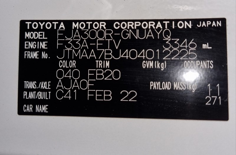 2022 Toyota Land Cruiser FJA300R GXL Year: 2022 Make: Toyota Model: Land Cruiser Series: FJA300R Badge: GXL Body: 4-Door SUV Drive Type: Four wheel drive Odometer: Indicating 33,595 Kilometers Engine: 3.3 V6 Twin Turbo Diesel Transmission: Automatic Colour: White Seats: 7 Description/extras: Air Conditioning, Power windows, SRS, Tinted windows, Cruise control, Climate control, Alloy wheels, AUX / USB, Towbar, Reverse camera, Central locking. Has books and 1 Key. VIN: JTMAA7BJ404012225 ENG No: F33A0015990 (AS PER PPSR) (Key #9CA, Marple) Lloyds stock #234787+1