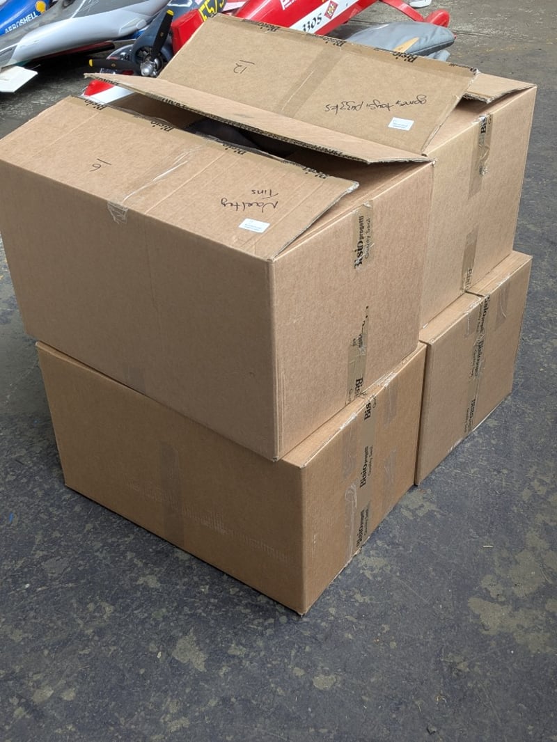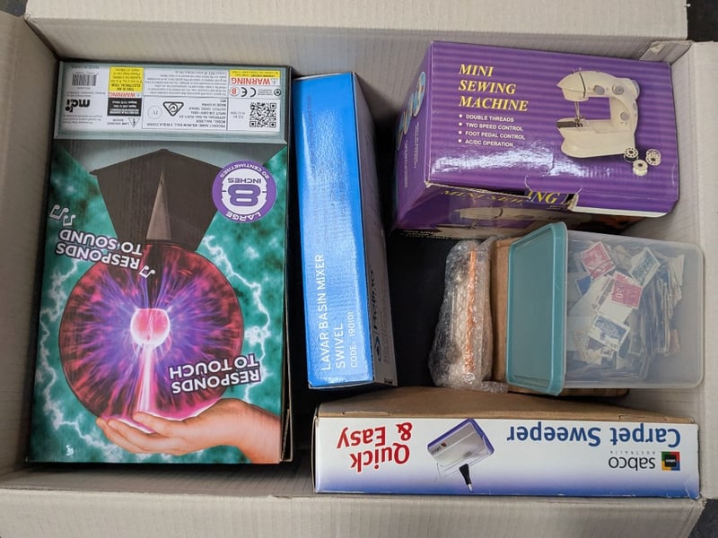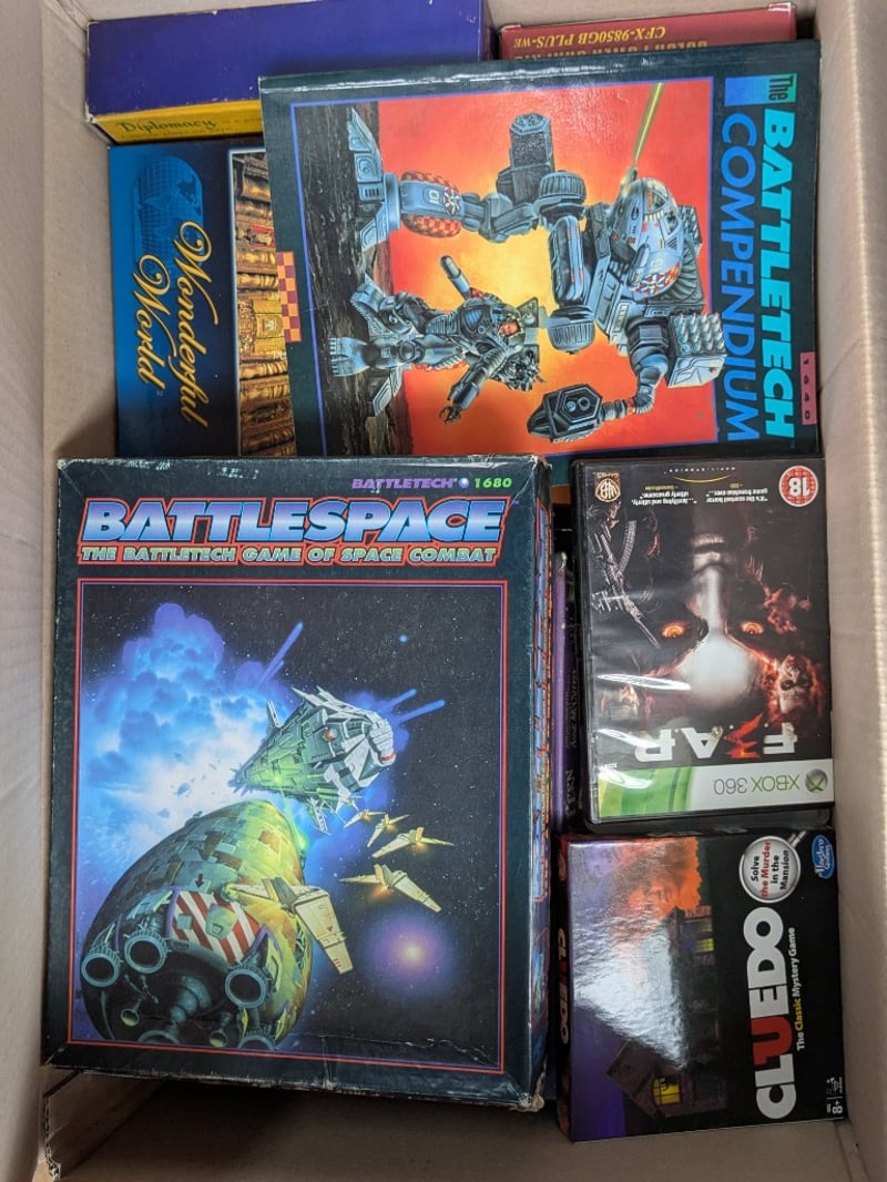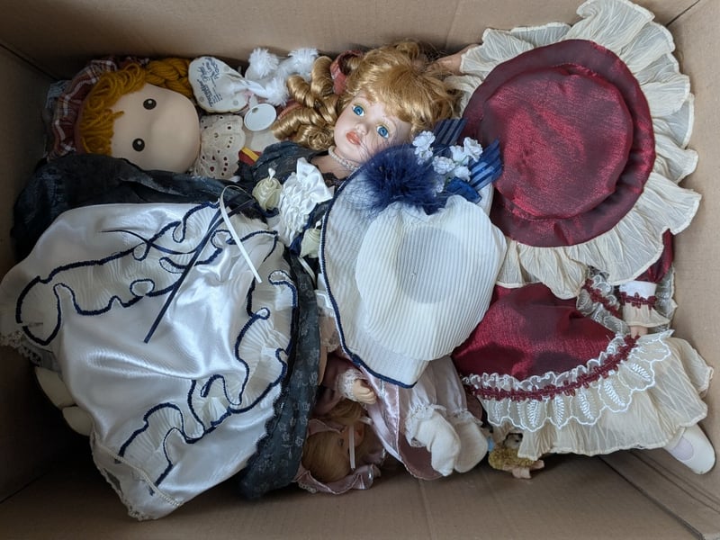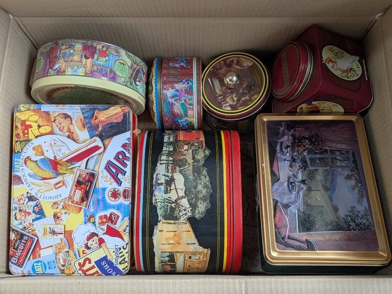 Homewares, 4 boxes including collectable tins, porcelain dolls, games/ toys and more Sold as lot