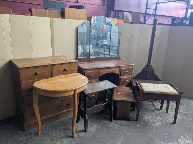 Furniture, 7 pieces including dressing table, tallboy, assorted side tables and more