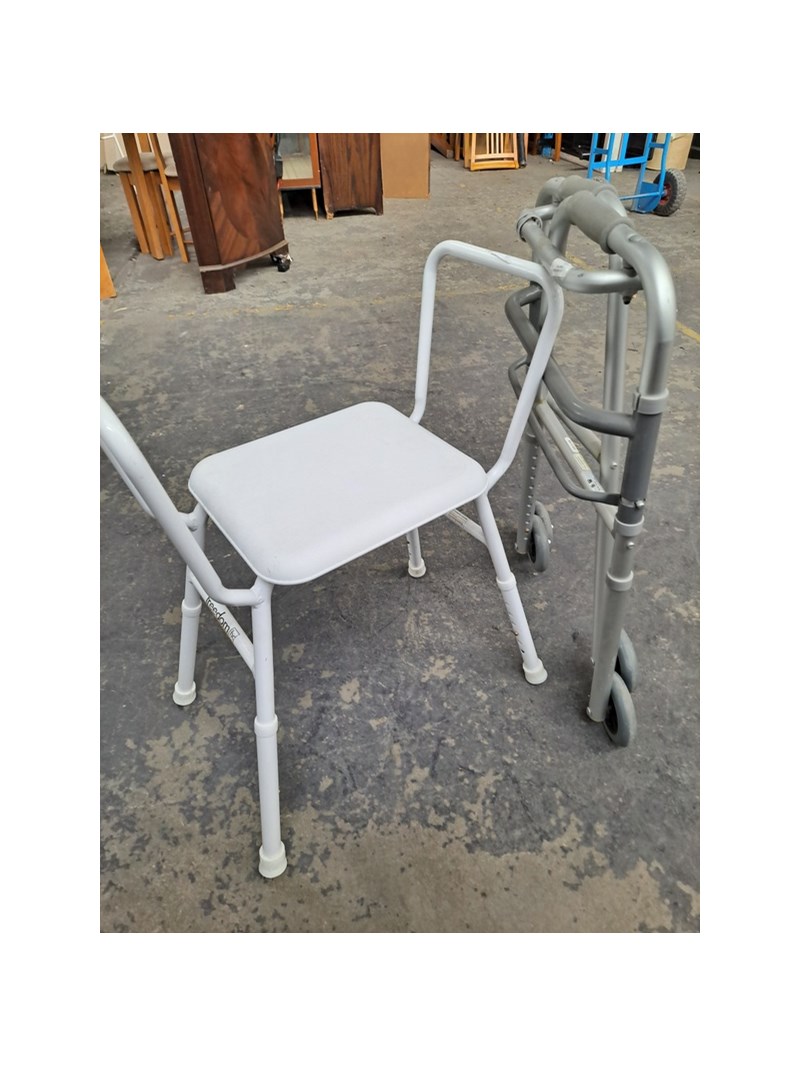 Mobility equipment, including 4x walking frames, 1x wheel chair and 1x shower seat