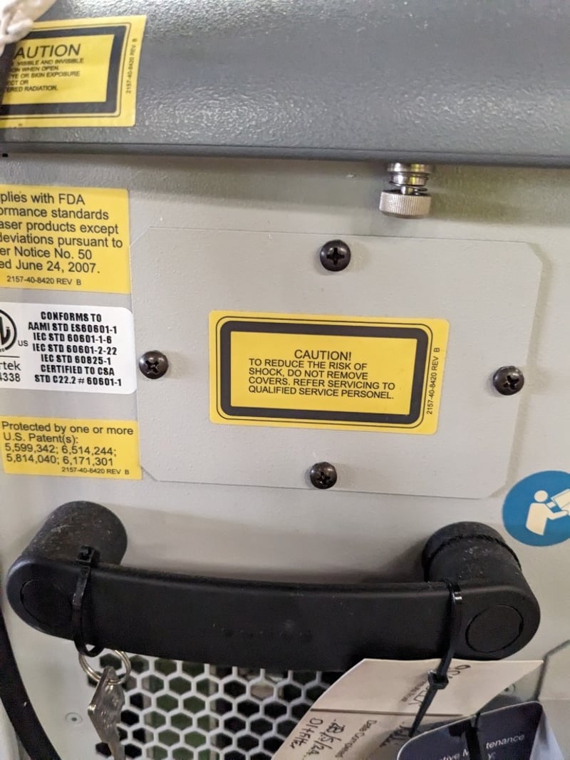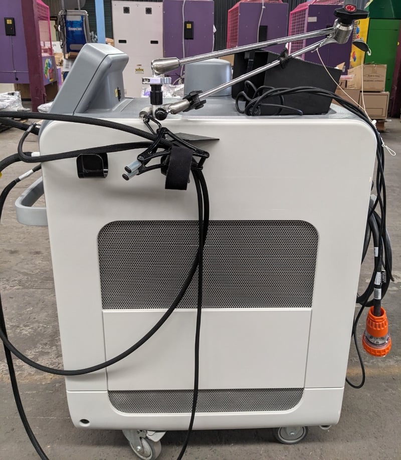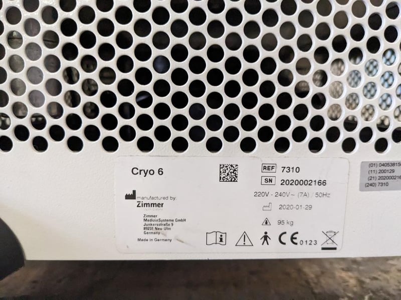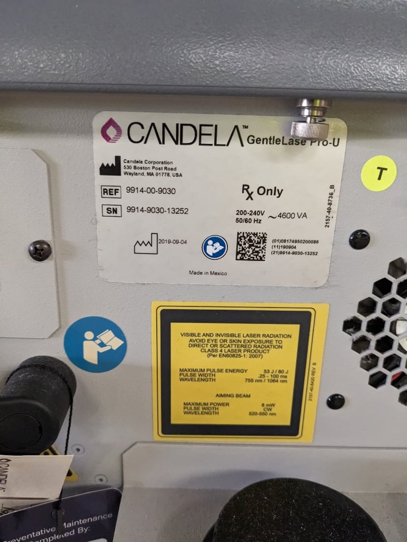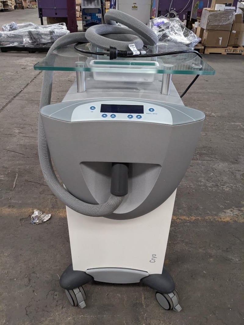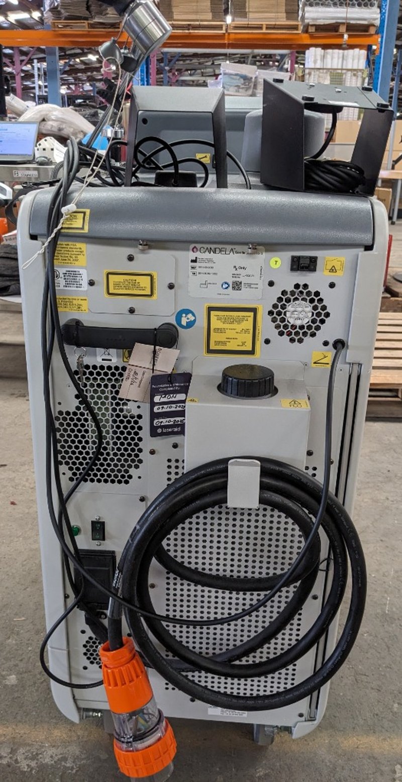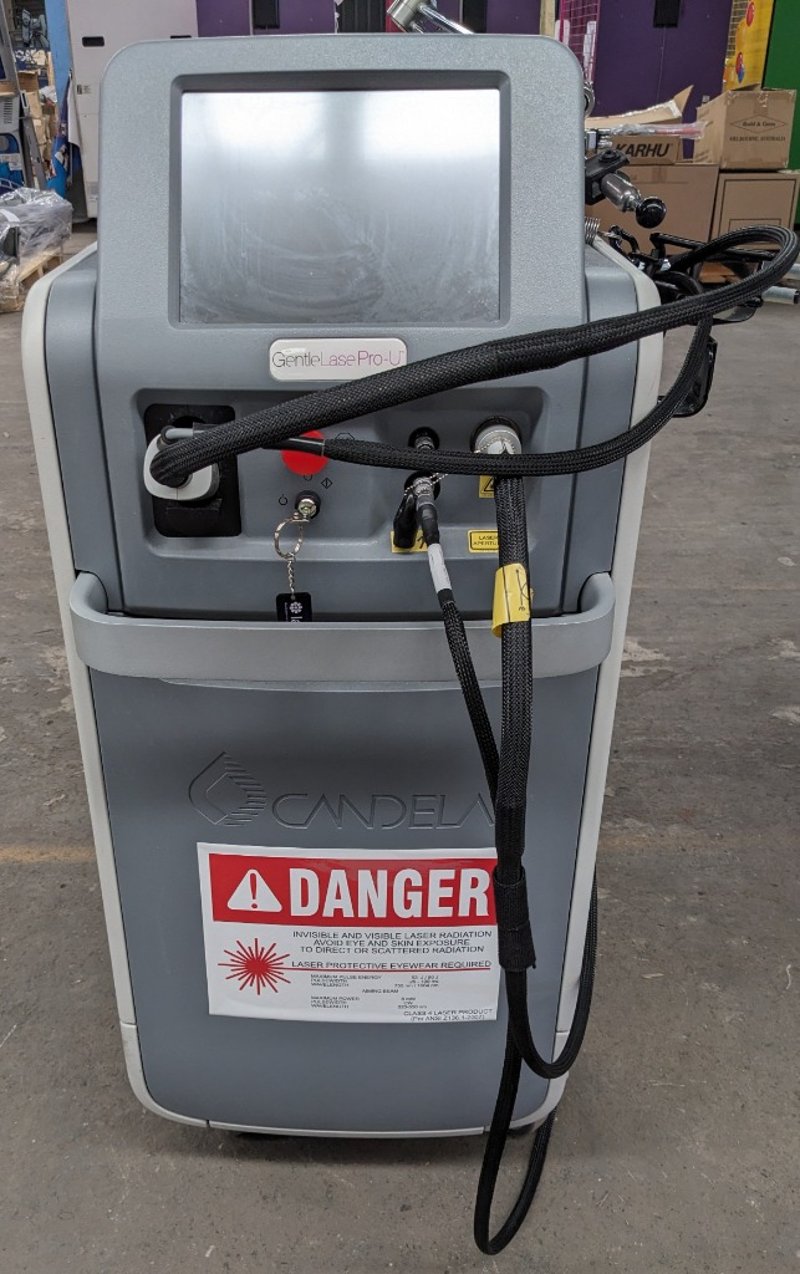Pulsed Laser Therapy Machine and Air Cooling System - Candela GentleLase Pro-U model 9914-00-9030, single-wavelength, colour LCD touchscreen control, Pro Series Specialty handpiece 20/22/24mm, Fisso articulated instrument arm, 2x Herga bellow foot switches, 415V, mobile, DOM: 09/19, S/N: 9914-9030-13252, Zimmer Cryo 6 model 7310, LED digital controls, 2x air clip ACC system handpieces, mobile, DOM: 01/20, S/N: 2020002166.
