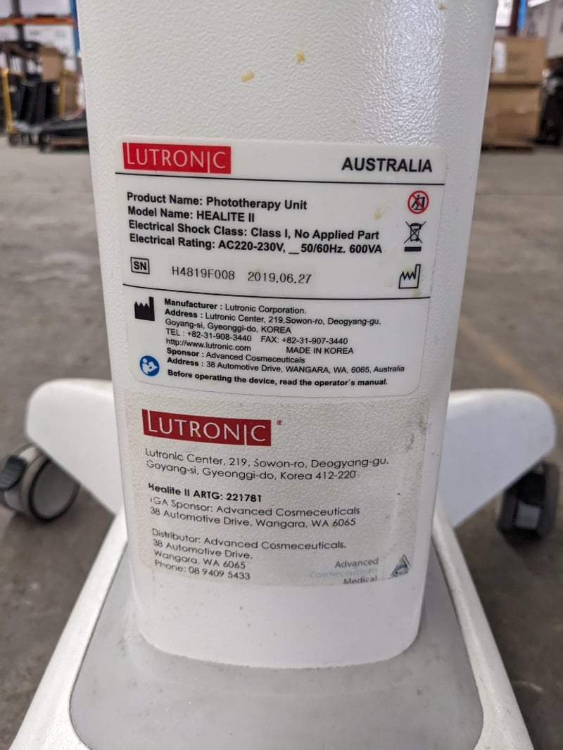 Phototherapy Unit - Lutronic Healite II, 830nm/415nm, 5x LED lamp head on adjustable arm, LCD touchscreen controls, mobile, DOM: 06/19, S/N: H4819F008