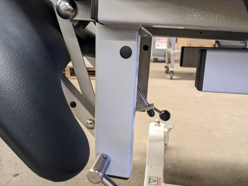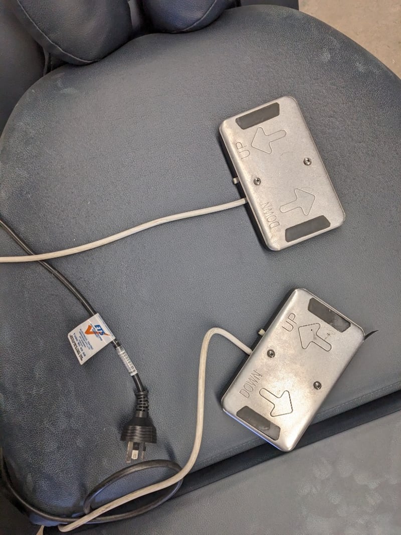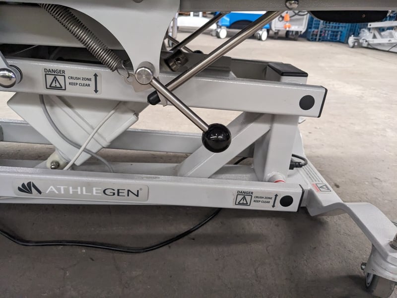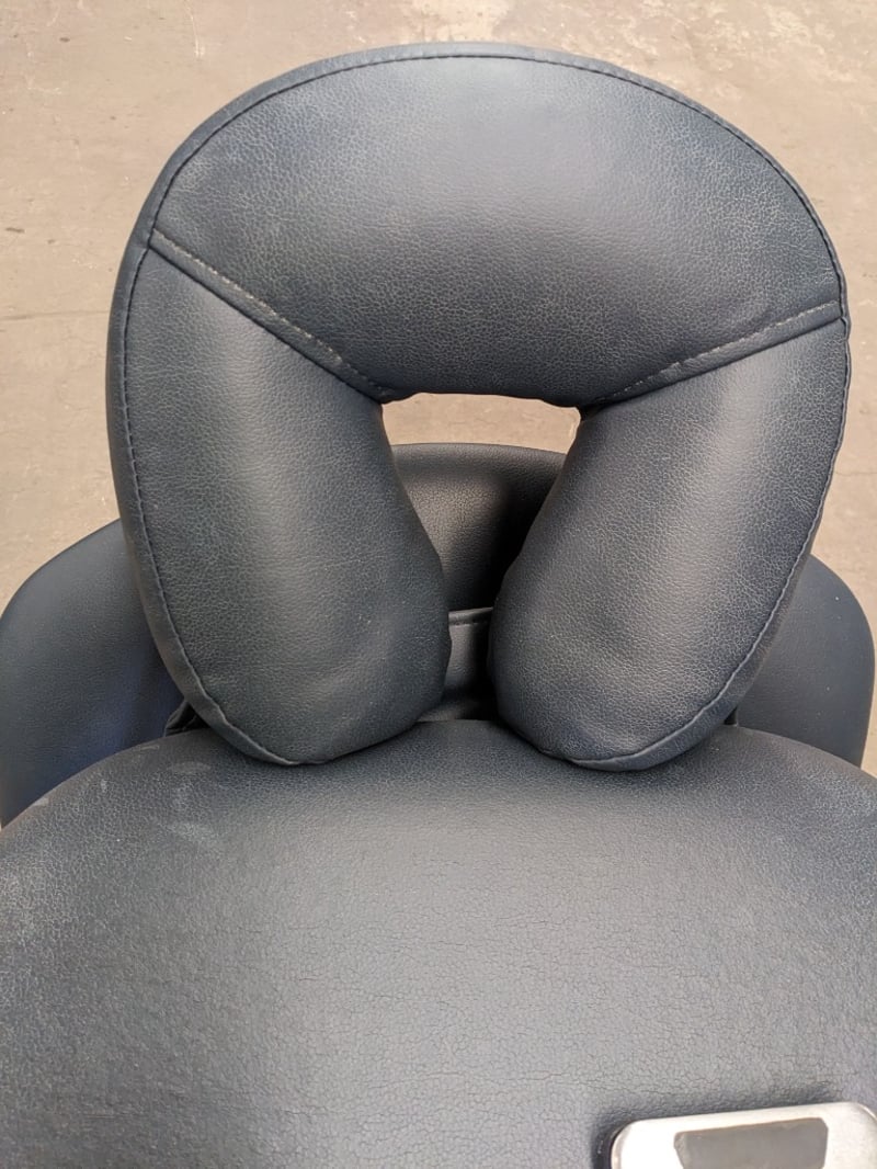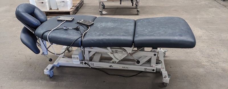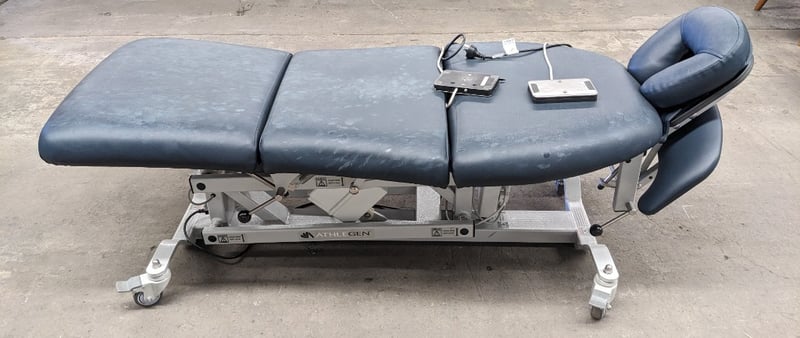 Electronic Spa and Bodywork Table - Athlegen Venus C model C3000, navy blue PVC padded upholstery, adjustable head and armrest, 220kg SWL, motorised backrest and seat tilt with dual foot controller, mobile, DOM: 2019, S/N: 020719622