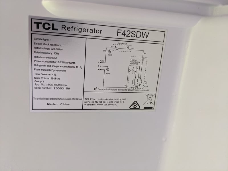 Mini Bar Refrigerator - TCL F42SDW, 41L, white, S/N: 23060159 Dimensions: (H)52cm x (W)44cm x (D)47cmNOTE: Signs of wear and tear, untested.