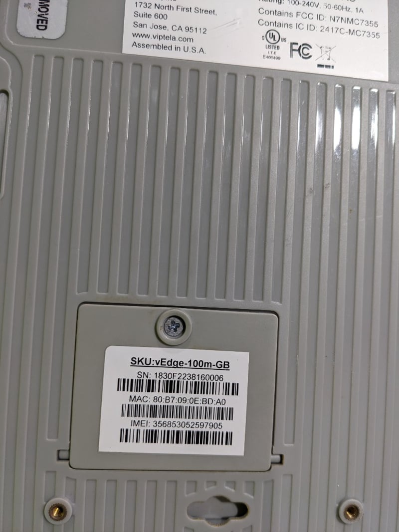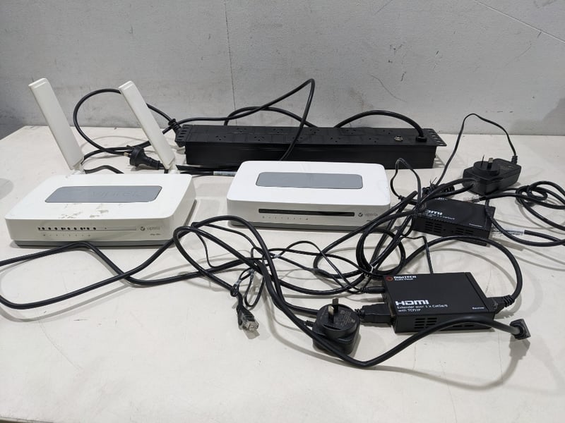 Assorted electronic items includes: Viptela vEdge-100m-AC router, S/N: 1830F2238160006, Viptela vEdge-100m-AC router, S/N: 1831A4F2415185103, B&R Data System Power Distribution Unit, S/N: TURNLINK-20180930 and 2x Digitech Audio Visual AC-1734-R/X extender NOTE: Signs of wear and tear, untested. Sold as a lot.
