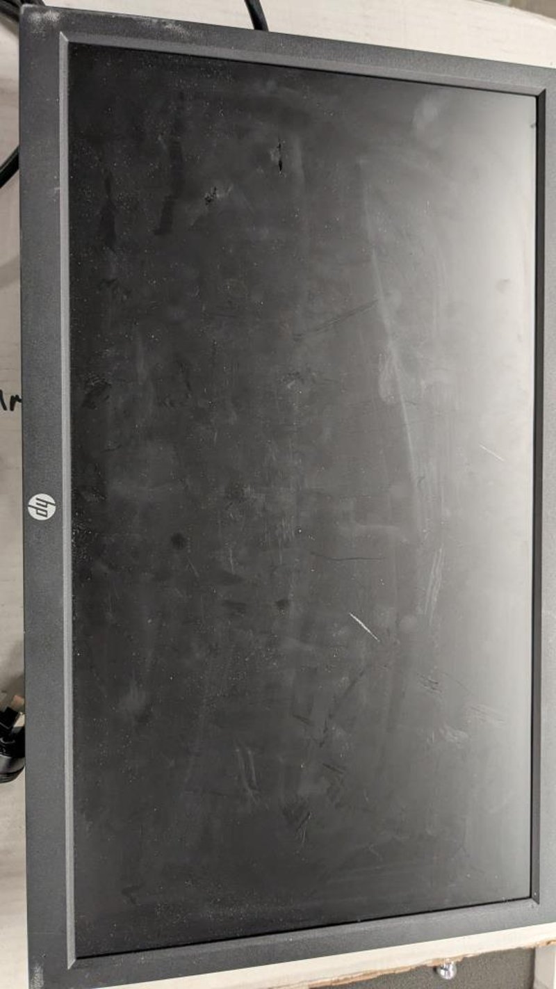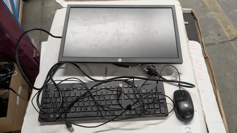Assorted electronic items includes: HP P204 19.5" HD LED post mounted monitor, DOM: 05/19, S/N: 3CQ91902SD with HP USB keyboard and USB mouse