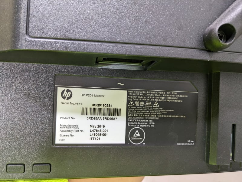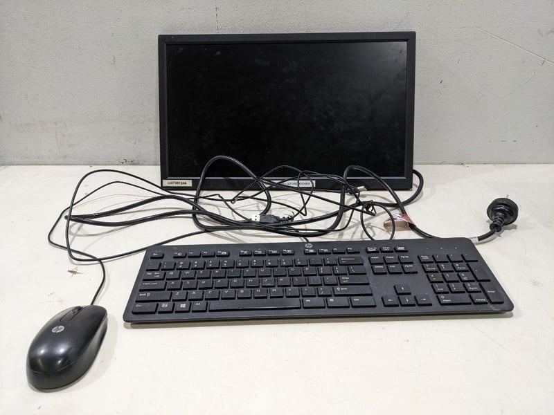 Assorted electronic items includes: HP P204 19.5" HD LED post mounted monitor, DOM: 05/19, S/N: 3CQ91902S4 with HP USB keyboard and USB mouse NOTE: Signs of wear and tear, untested. Sold as a lot.