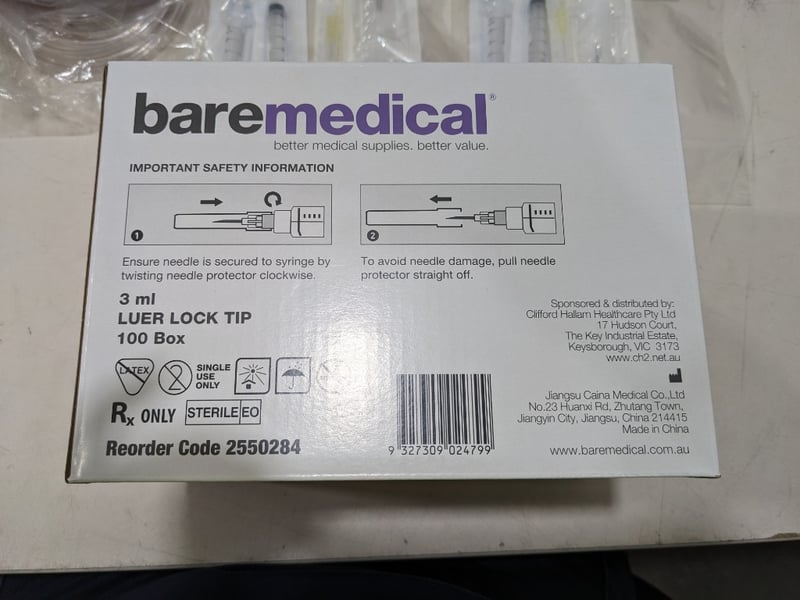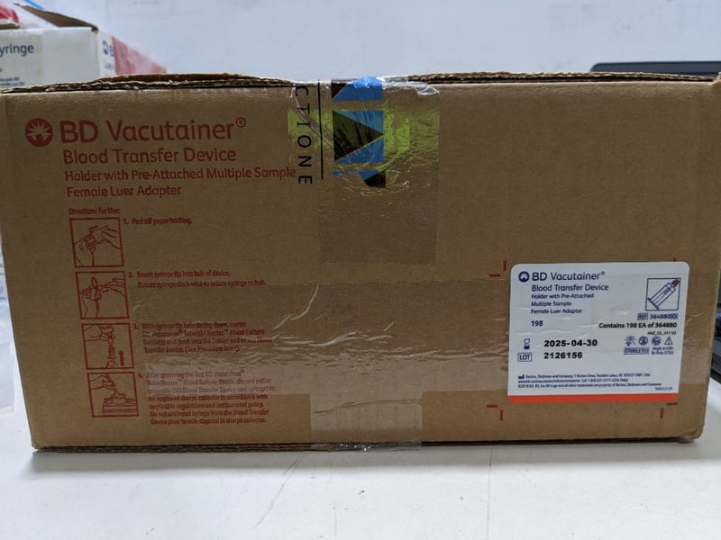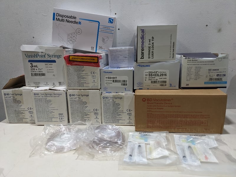 Assorted items includes, syringe 1mL, syringe 3mL, blood transfer device and more. Sold as a lot.